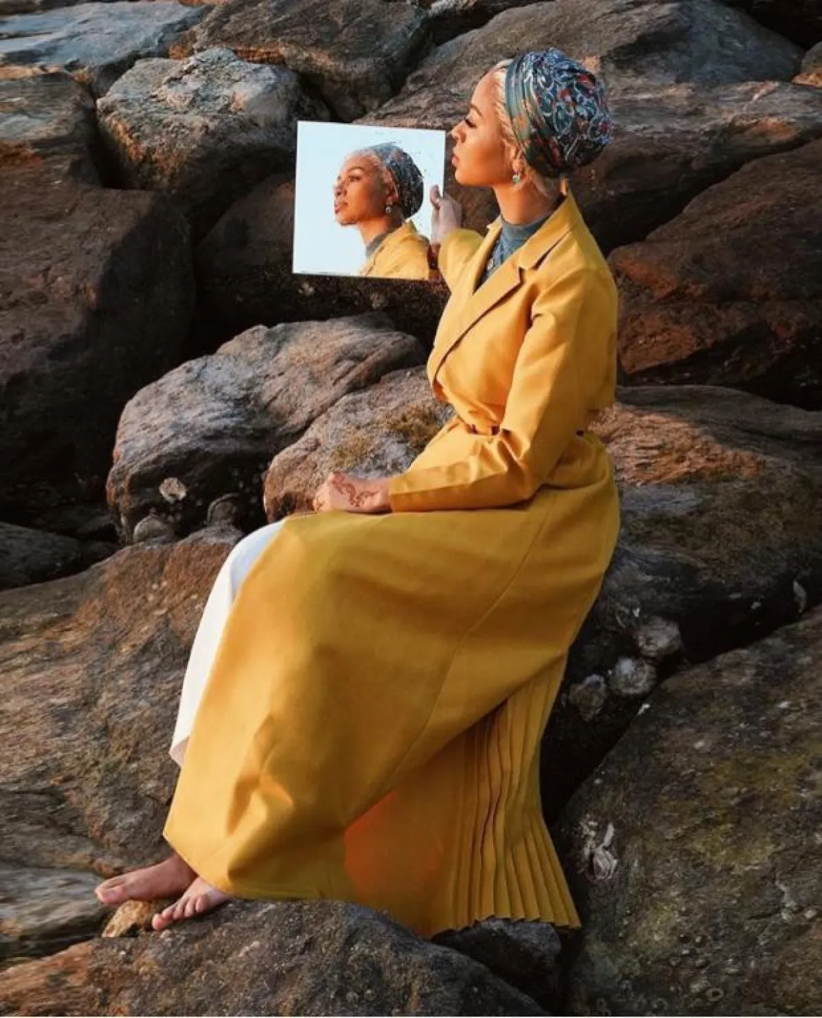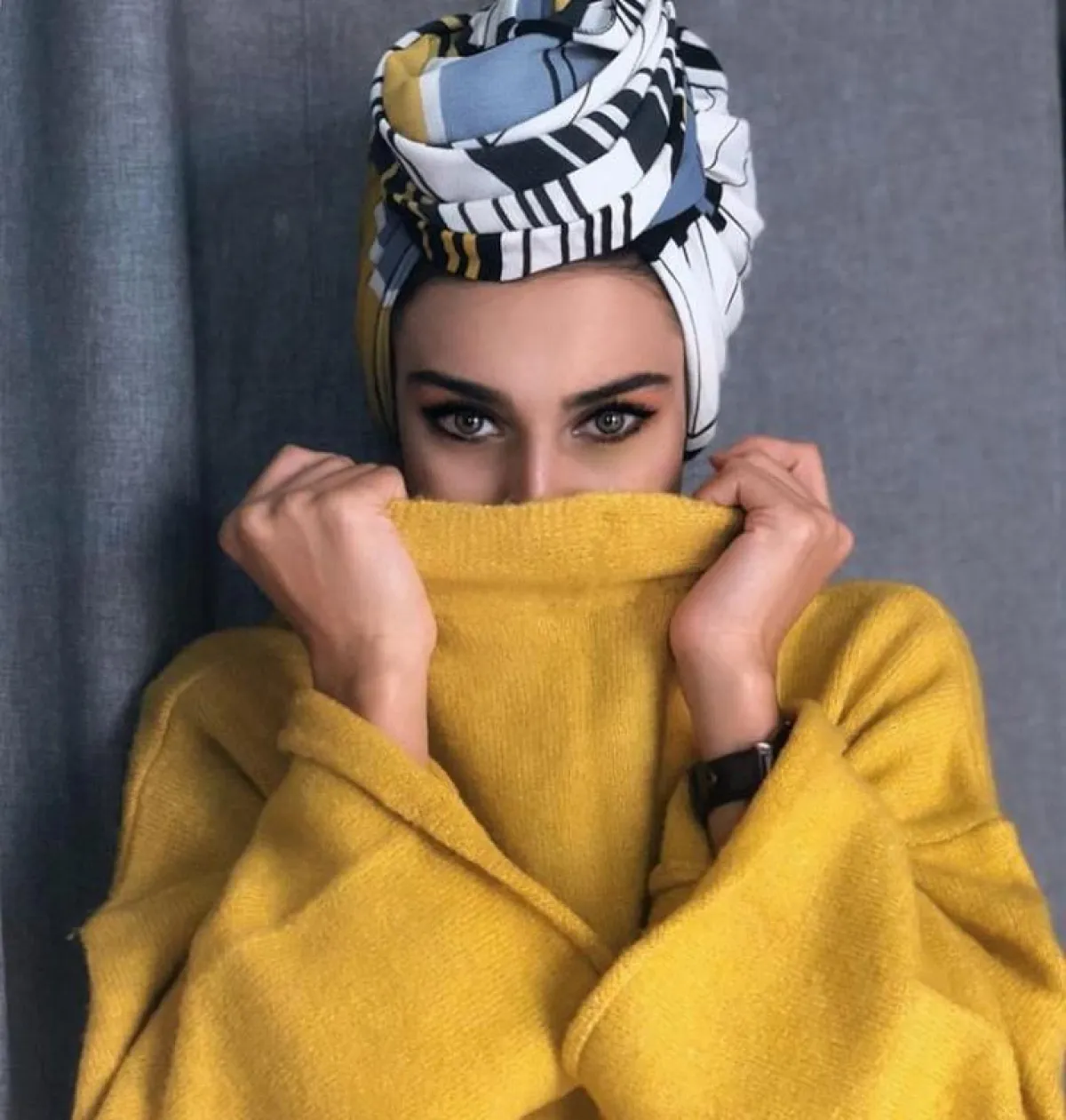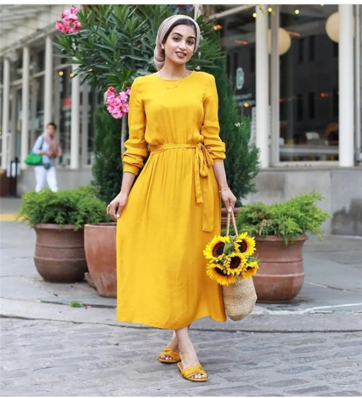 الفساتين هذا الصيف ستكون منعشة باللون الأصفر، اعتمديها بالطريقة الحيادية على طريقة هاجر، مع حذاء المول المفتوح الأصفر، وشنطة خوص، وتوربان يمكنكِ اعتمادها باللون نفسه، أو بالنود الهادئ كالذي اعتمدته هاجر.