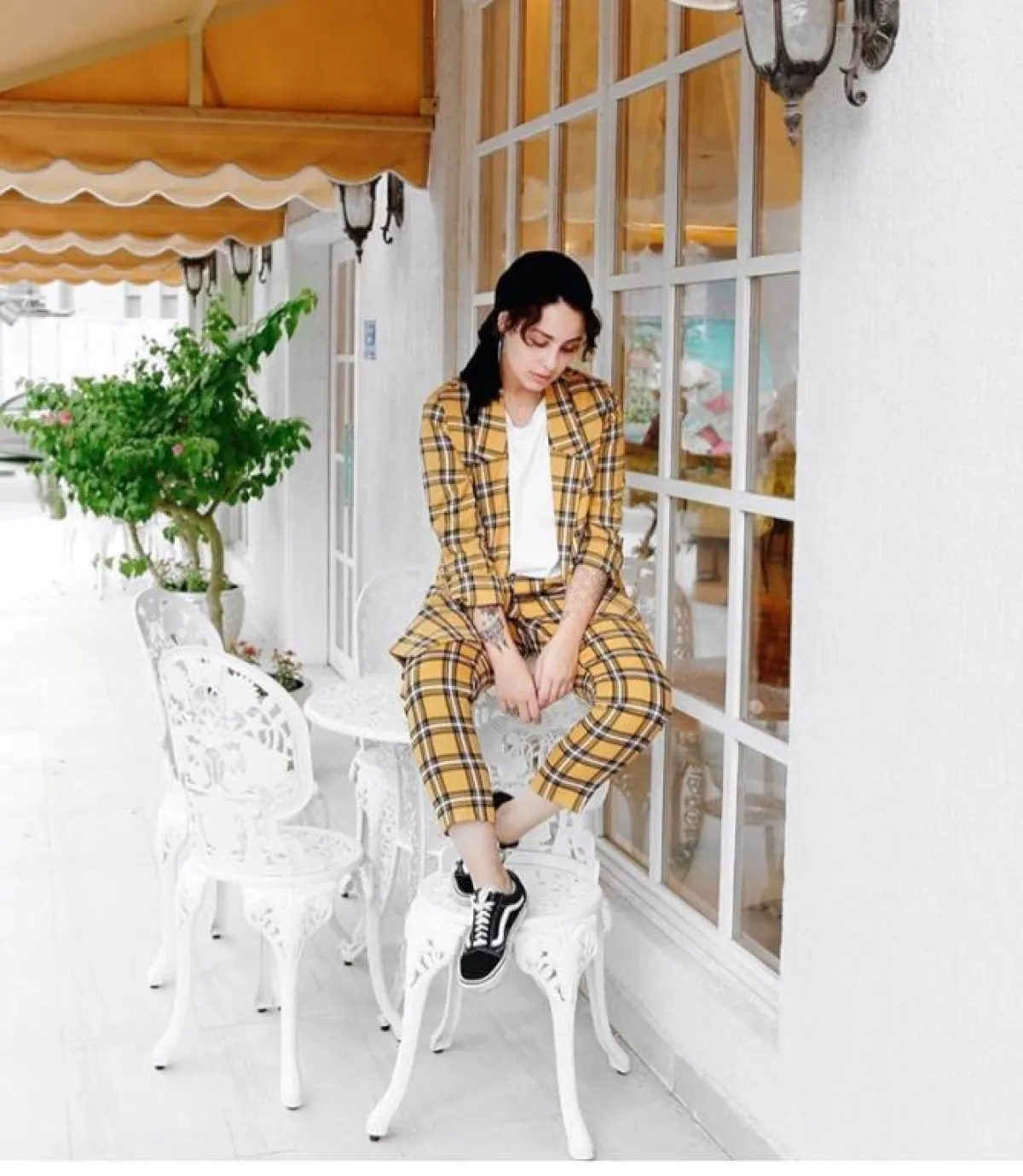 بلمسة كلاسيكية حولتها الفاشينيستا آسيا إلى كاجوال، اختارت البدلة الكاروهات الصفراء، مع لفة التوربان السوداء، والسنيكر الأسود.