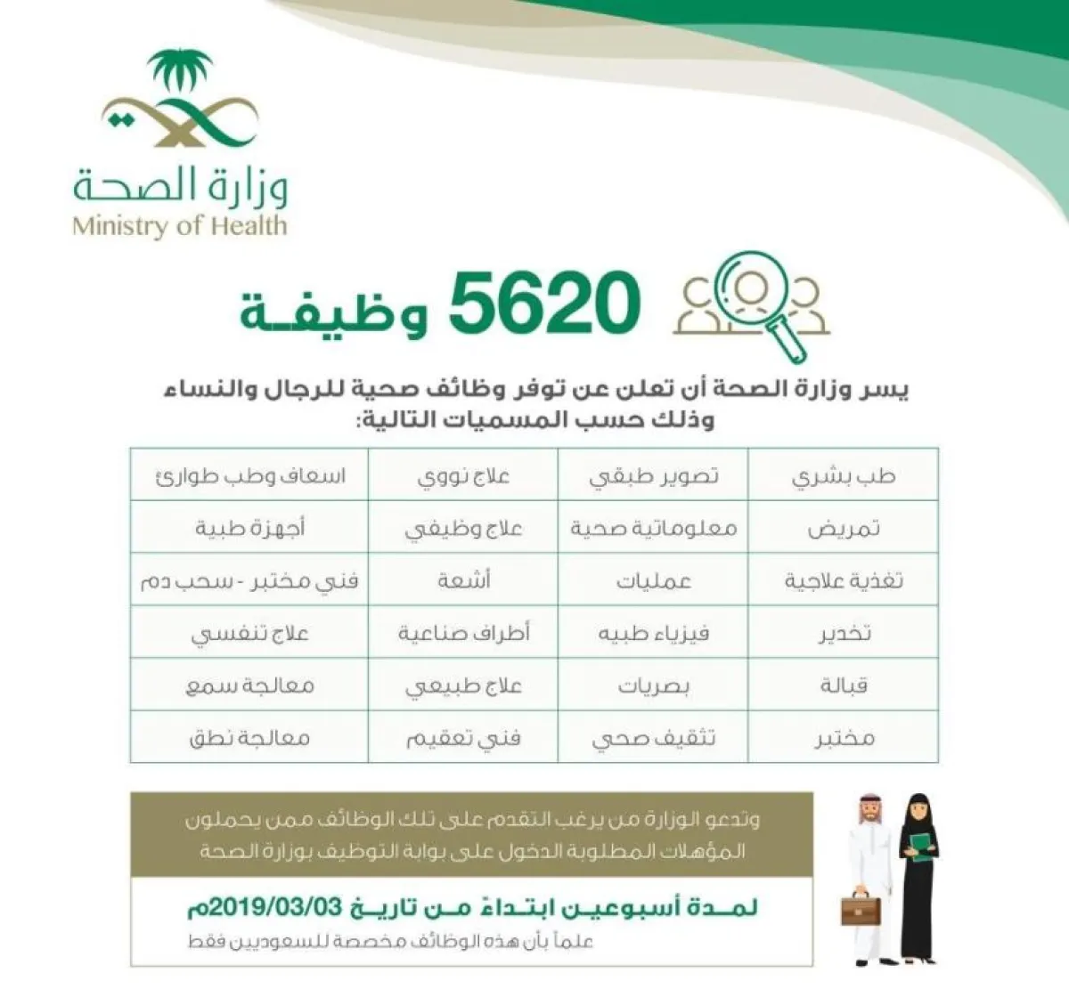كشفت وزارة الصحة عن توفر 5620 وظيفة صحية للمواطنين والمواطنات فقط، مبينةً، أن التقديم يمتد لمدة أسبوعين ابتداءً من تاريخ 3 / 3 / 2019م.