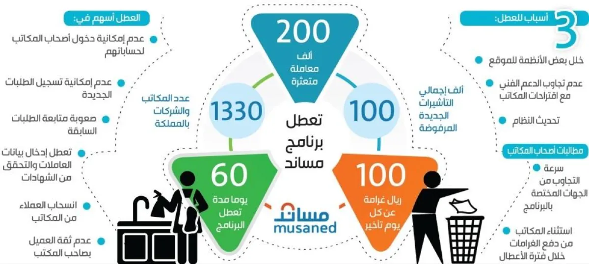 تسبب تعطل برنامج "مساند" لمدة 3 أشهر تقريباً في تأخير إجراءات استقدام 200 ألف عاملة منزلية، ورفض نحو 100 ألف تأشيرة جديدة، وذلك وفقاُ لما أكدت عليه مصادر مطلعة.