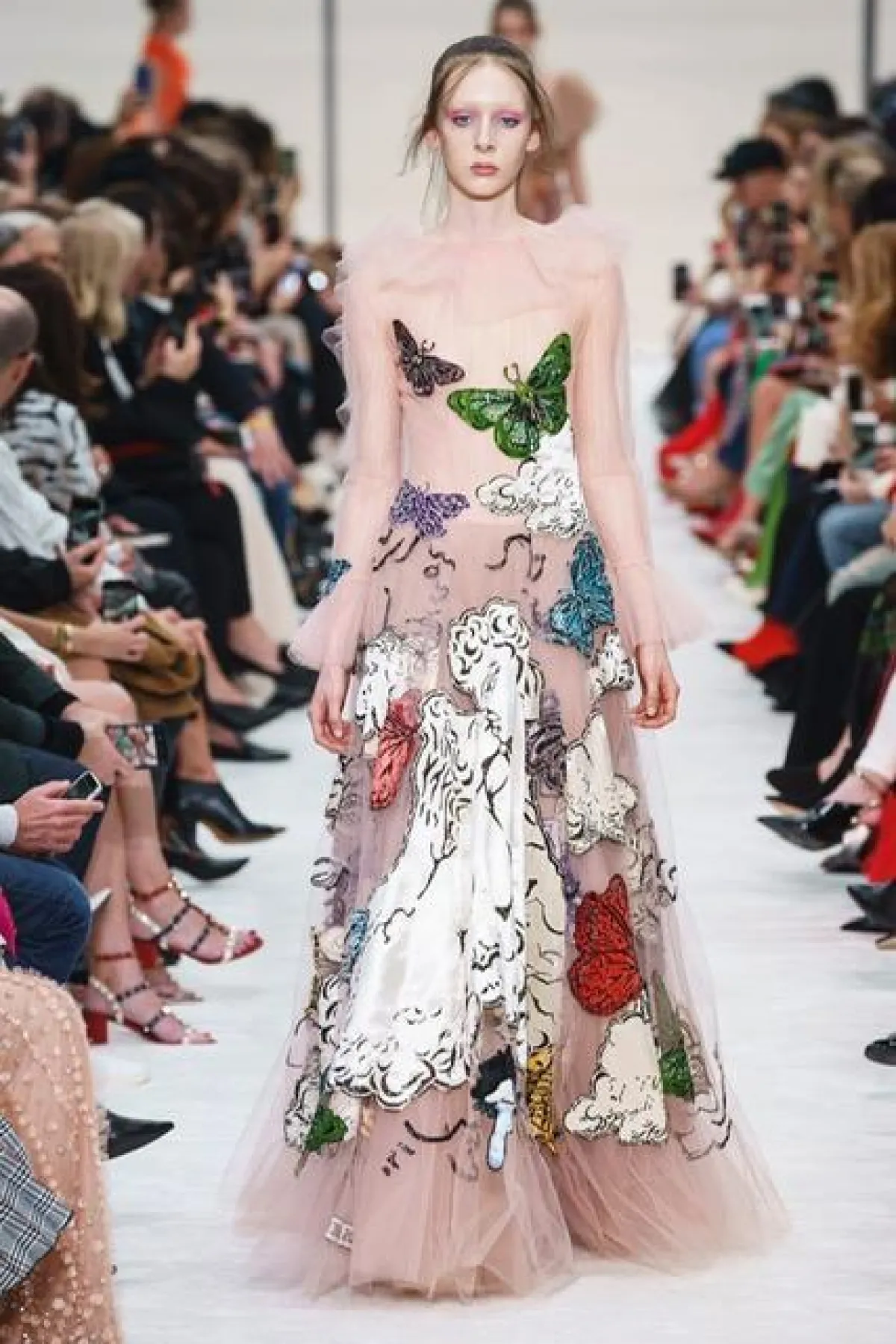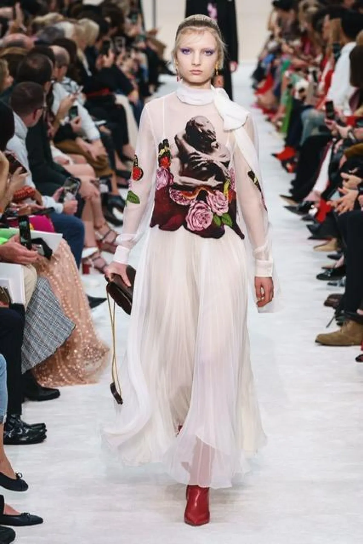 من جهته أخذنا "بياباولوبيكيولي " PierpaoloPiccioliالمصمم الإبداعي لدار " فالنتينو " Valentino إلى عالم الأنثروبولوجيا والشعر، حيث قدّم مجموعة من الأزياء الغنية بالرسومات والتطريزات، التي عكست التماثيل الرومانية المتعانقة، جسدها في تطريزات ورسومات الفراشات والورود ،ترمز للحب والشعر، تنوعت أزياء العرض ما بين المعاطف الشتوية والفساتين ذات القصات العريضة من الأسفل، تحاكي الوردة عند تفتّحها ، و تشكيلة أخرى من فساتين السهرة المصنوعة من الدانتيلا السوداء والتول المطرز، وجمبوستات صُنعت من قماش الساتان ،جاءت معظم أزياء العرض في غاية الأناقة والتميز، الأمر الذي انتزع إعجاب الحاضرين الذين صفقوا لدقائق طويلة عند انتهاء العرض .
