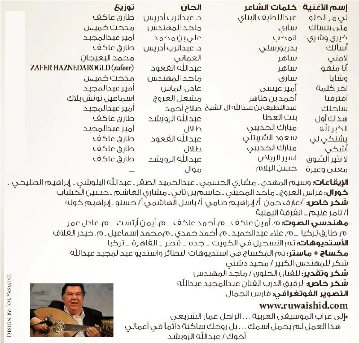 أغنية " آخـــر كلمة " كلمات الشاعر أمير عيسى و ألحان عادل الماس . وأغنية " سـاحلك " كلمات الشاعر عبد اللطيف آل الشيخ وألحان صلاح أحمد . وأغنية " إفترقنا " كلمات الشاعر أحمد بن ظاهر والحان مشعل العروج ، أغنية " هذاك أول " كلمات الشاعرة بنت العطا وألحان الفنان عبد الله الرويشد . أغنية " الكبر لله " كلمات الشاعر مبارك الحديبي وألحان طلال ، وأغنية " يشتكي لي" كلمات الشاعر القدير سعود شربتلي والحان عبد الله القعود ، وأغنية "أشــكي " كلمات الشاعر مبارك الحديبي ، الحان طلال ، وأغنية "لا تثير الشوق " كلمات الشاعر أسير الرياض ، الحان الفنان عبد الله الرويشد . أخيراً يختتم الفنان الكبير عبد الله الرويشد ألبومه بموال ، " معنى وعبر " للفنان الدرامي حسن البلام.