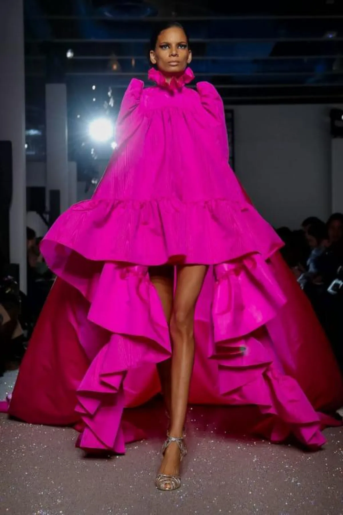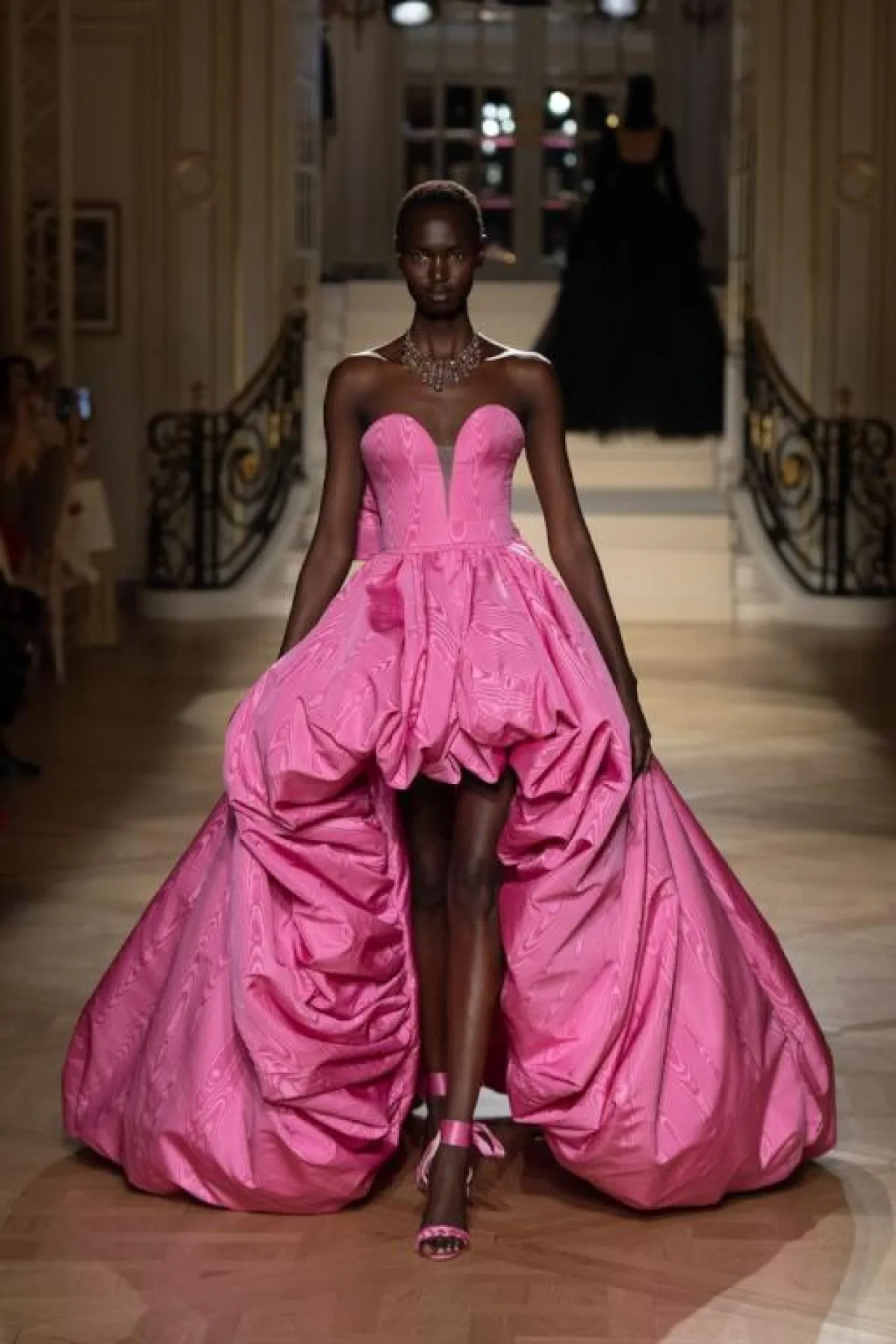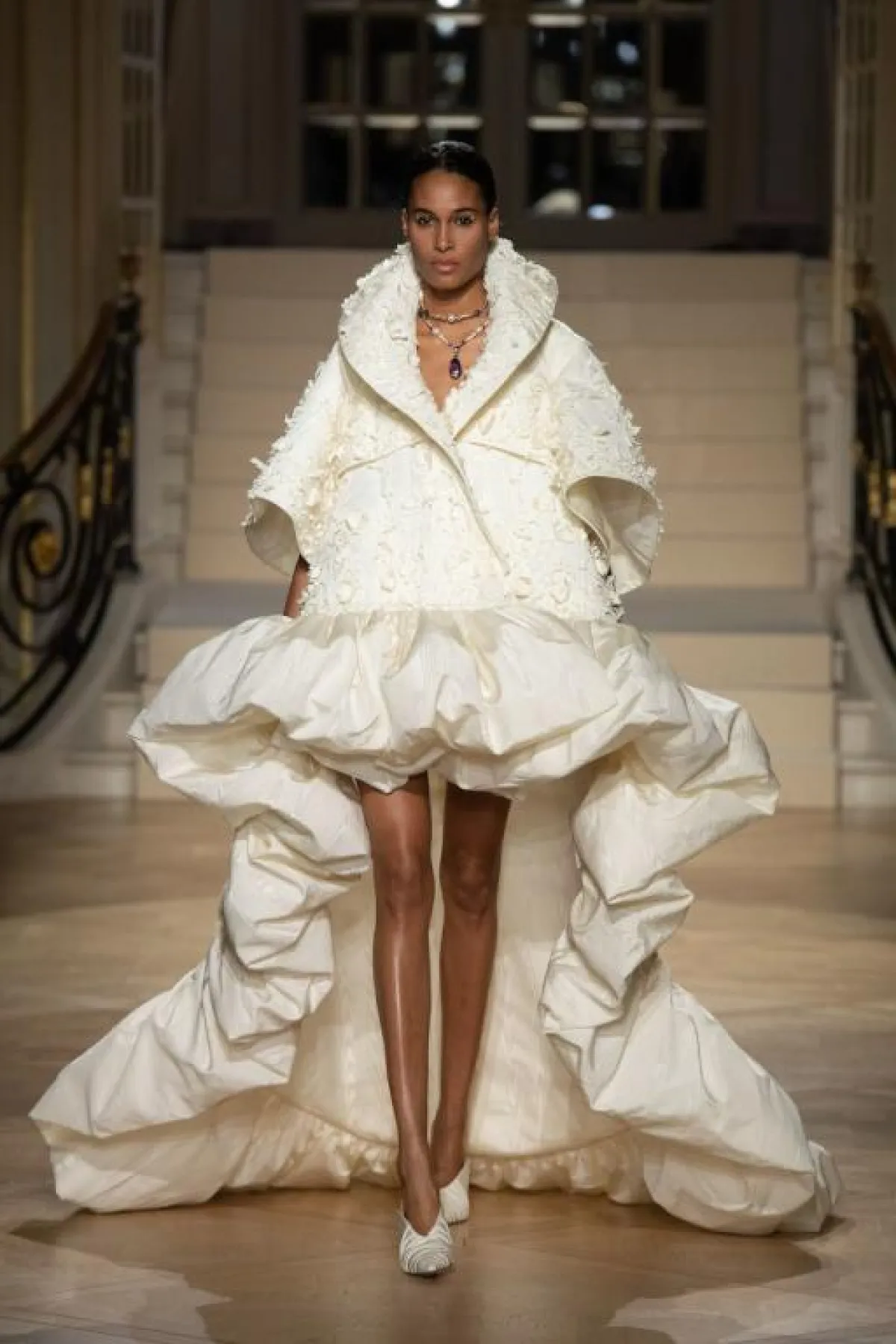 وقدمت دار رالف وروسو Ralph & Russo، هذه الصيحة بأسلوب أنثوي راقي، فأحببنا الفستان البني الأقصر من الأمام قليلاً، مع التنورة المنفوشة والوشاح الأورغانزا، وكذلك الفستان الأبيض بالطبقات متدرجة الأطوال.