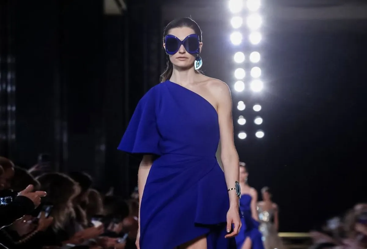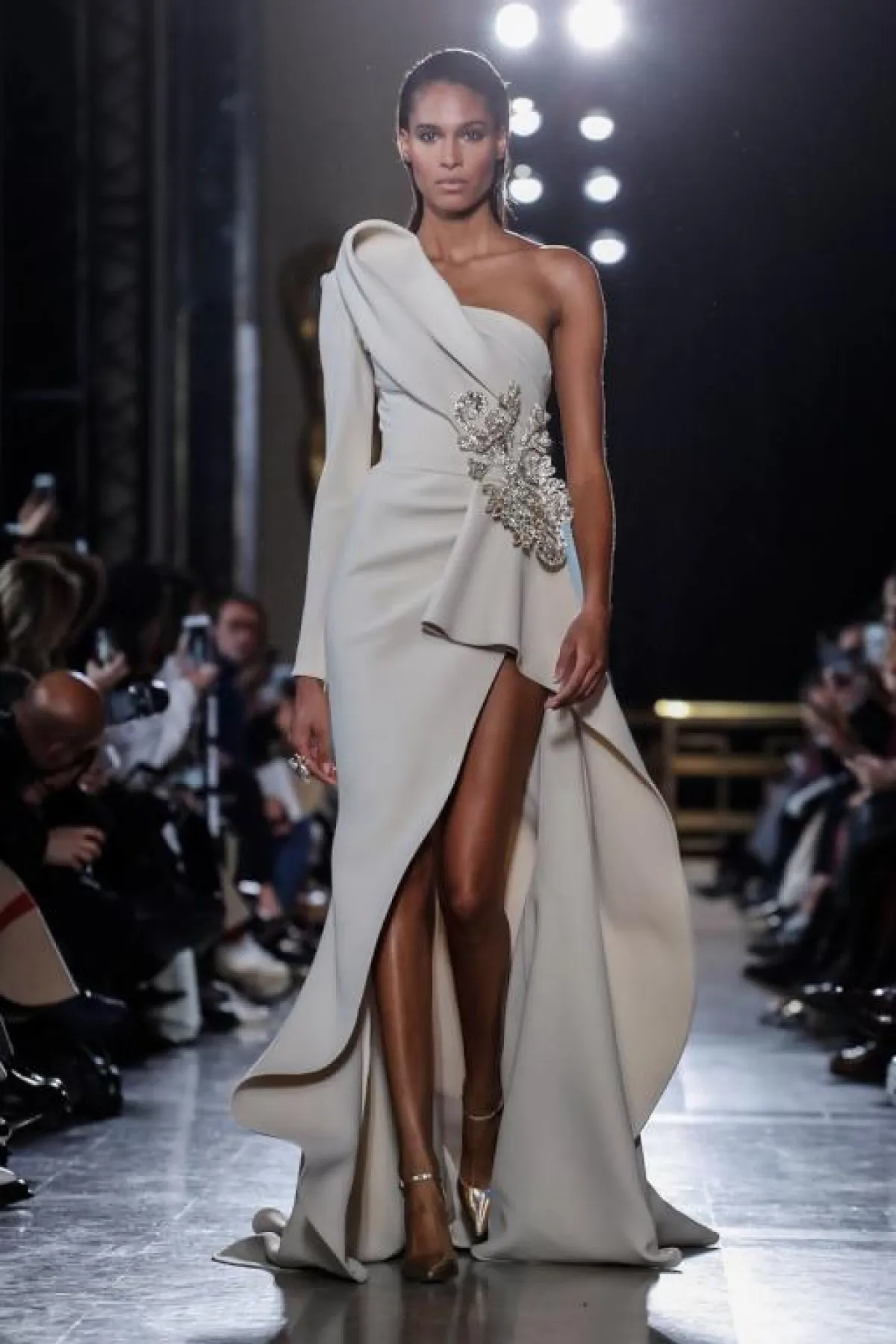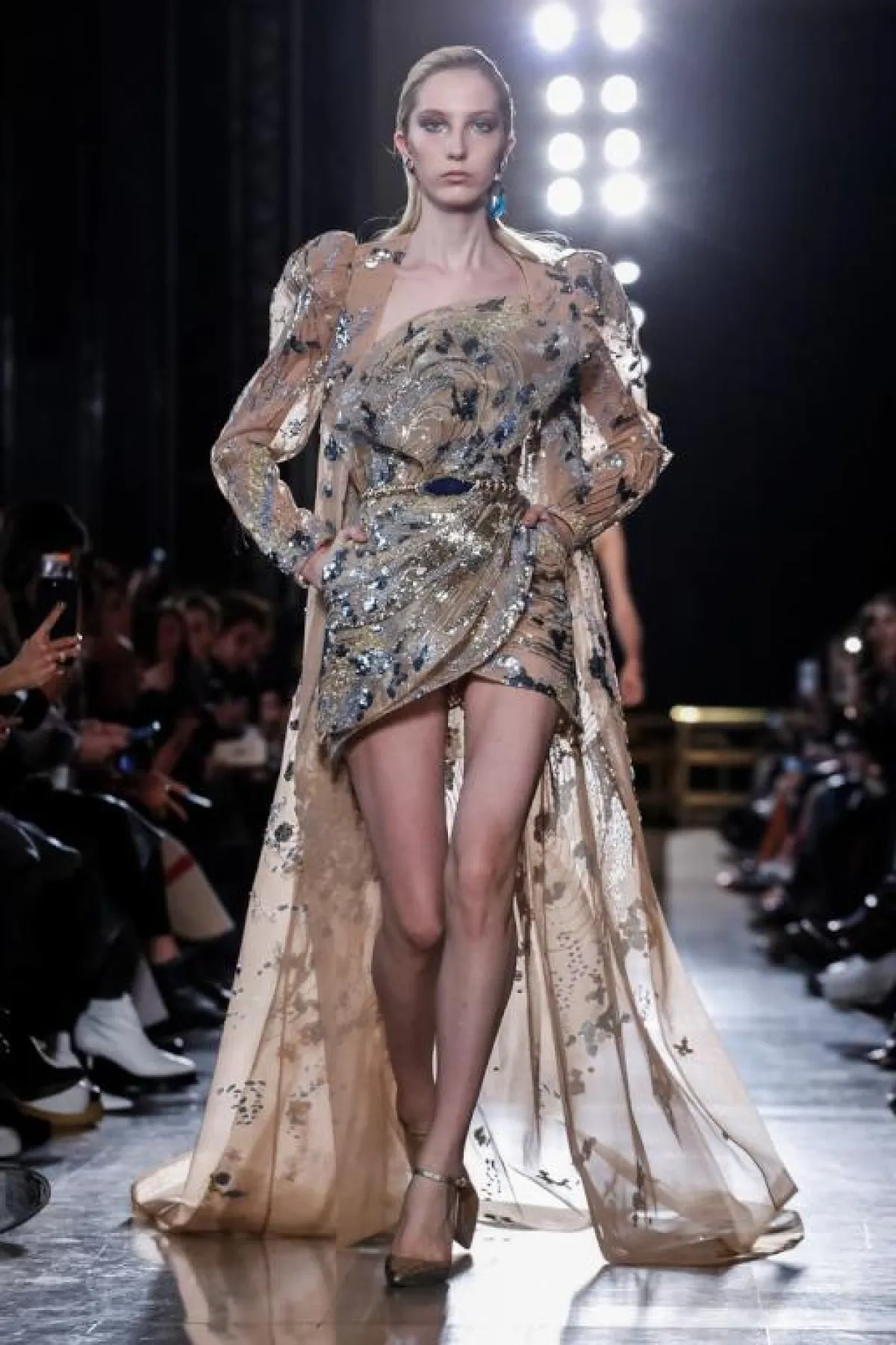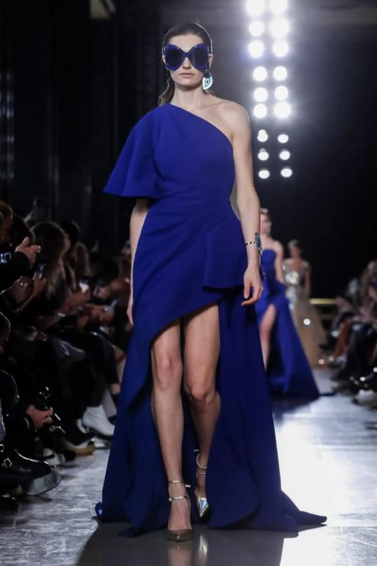 قدم المصمم اللبناني ايلي صعب Elie Saab، فستان قصير جداً من الأمام وطويل جداً من الخلف، يجمع بين الأنوثة والبساطة، مع ثنيات وطيّات في القماش الشفاف أكسبته سحر خاص.