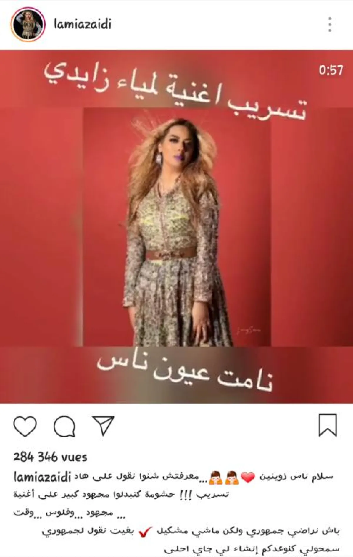 وقالت لمياء الزايدي في تدوينة نشرتها عبر صفحتها الخاصة على تطبيق الصور والفيديوهات "إنستقرام"، "لا أدري ماذا أقول بخصوص هذا التسريب، حشومة، نبذل مجهودًا كبيرًا على أغنية، وأموالًا ووقتًا لنفاجأ بأفعال من هذا القبيل".