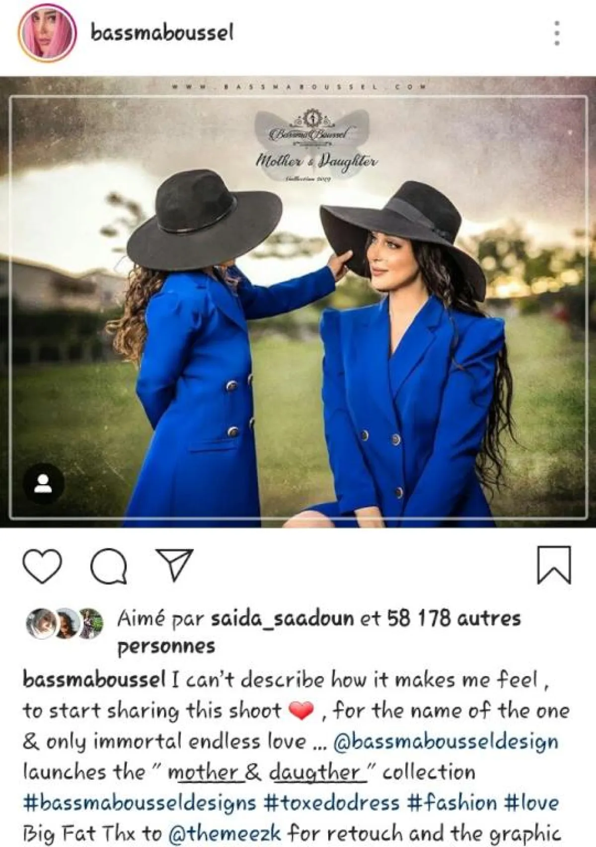 نشرت الفنانة المغربية المعتزلة بسمة بوسيل، زوجة الفنان المصري تامر حسني، صورة من تصميماتها على تطبيق الصور والفيديوهات "إنستقرام"، لمجموعة أزياء جديدة أطلقتها مؤخرًا وتحمل اسم "الأم والابنة".