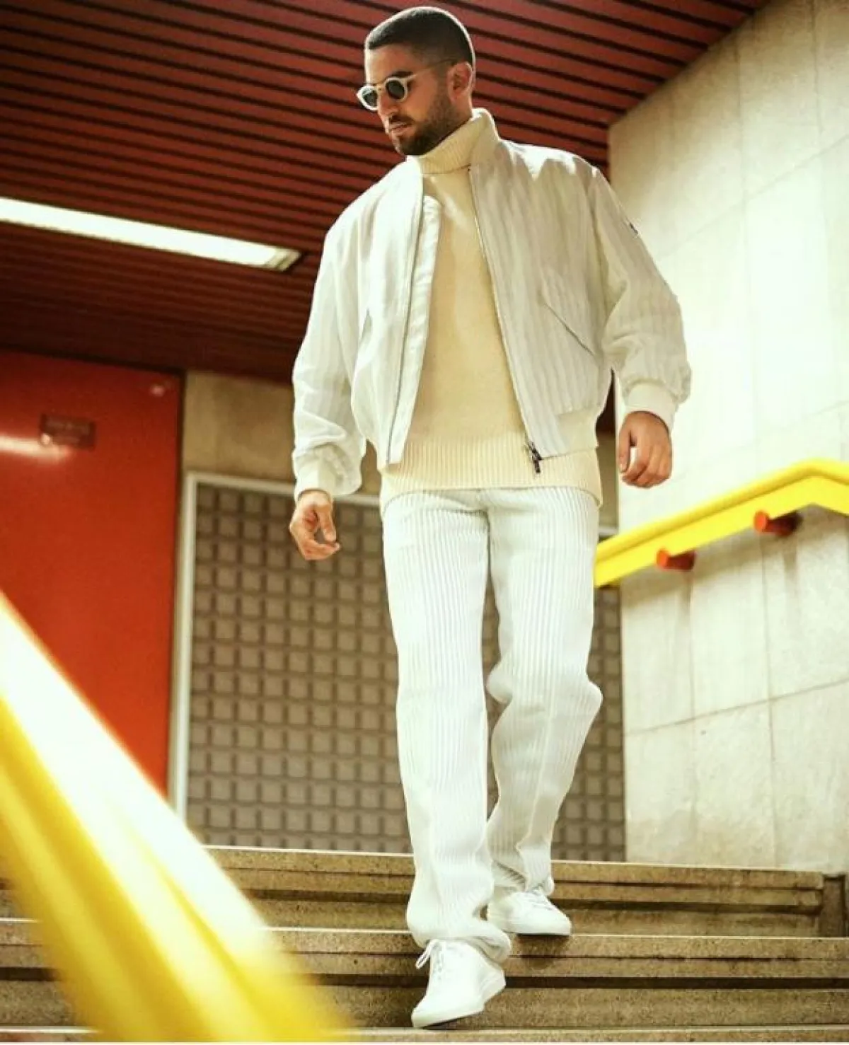 من أسهل التطبيقات وأكثرها عصرية، هو اعتماد الاطلالة الحيادية، كهذه الطريقة التي اختارها الياس العنداري للجاكيت القصير باللون الأبيض المخطط بالطول، مع بنطلون من اللون نفسه مخطّط أيضًا، وبلوفر بالأصفر الباهت، وهذا اللوك مثالي لقصيري القامة، ولكن يفضل أن يكون البنطلون أكثر قليلًا.