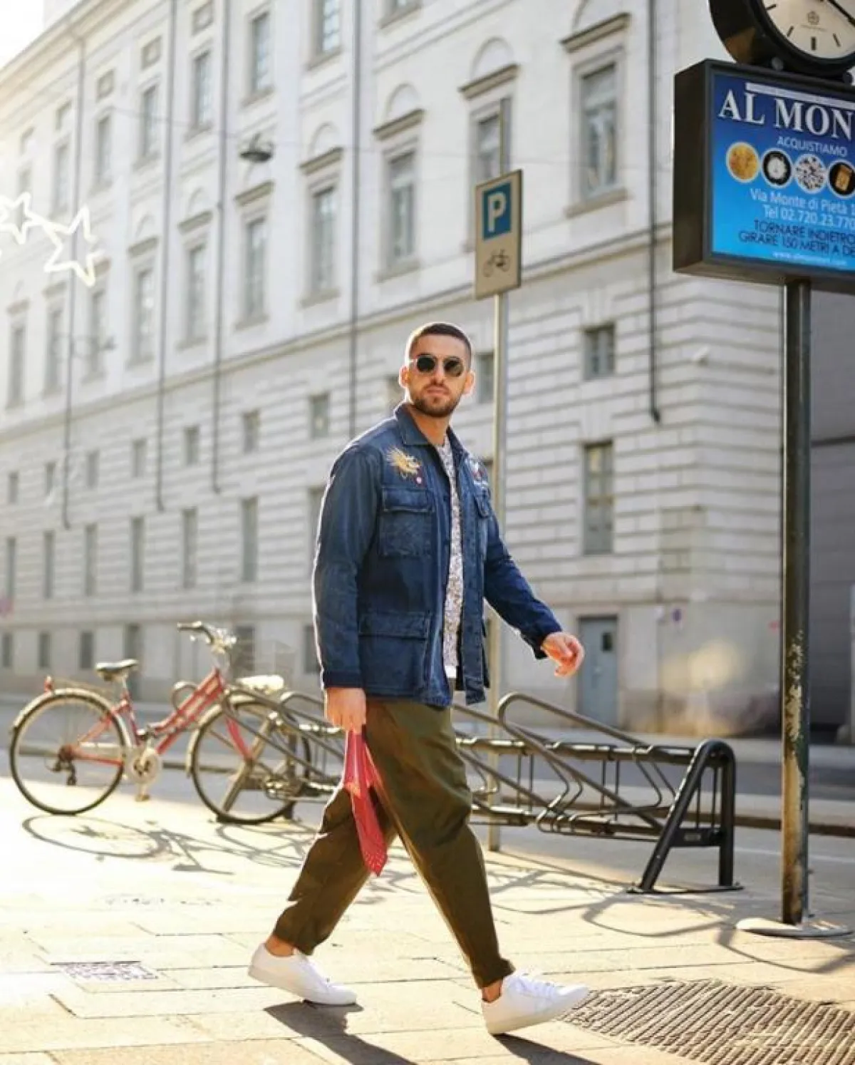 لا يمكننا الحديث عن الجاكيت القصير من دون أن يكون الجينز مدرجًا بالقائمة، كـ الجاكيت الجينز مع العلامات المختلفة الملونة، التي أضافت لمسة عصرية، نسقه إلياس مع بنطلون باللون الأخضر الزيتوني الواسع، لاطلالة مريحة، وسنيكرز أبيض.