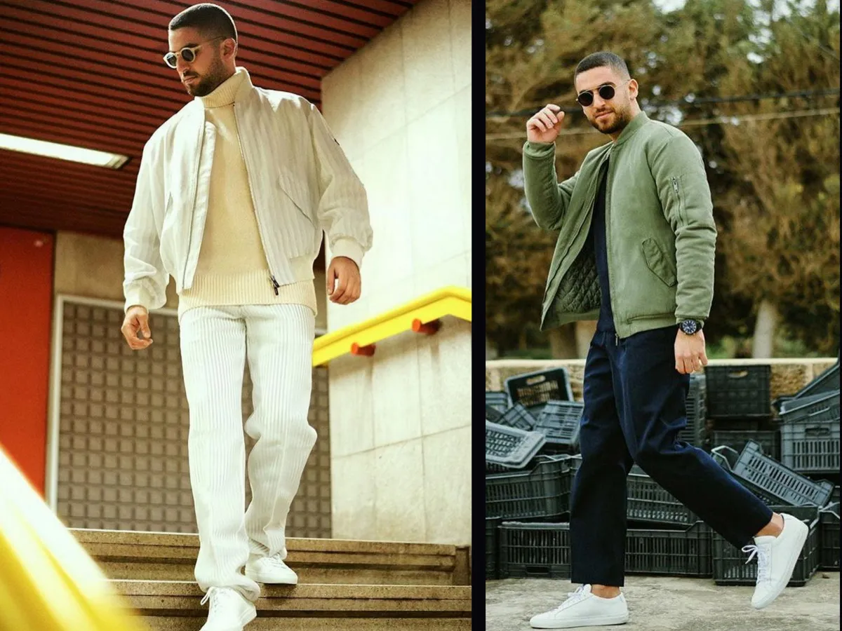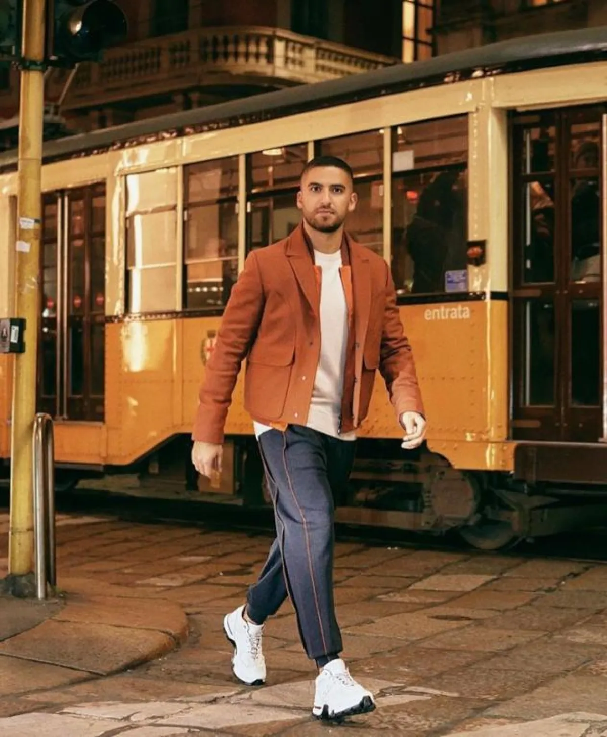 كالجاكيت باللون الأخضر العشبي الذي يجمع بين الكاجوال والكلاسيكية، نسقه الياس بطريقة بسيطة مع البنطلون والتوب الواسع، والسنيكرز الأبيض، ونظارة دائرية عصرية.
