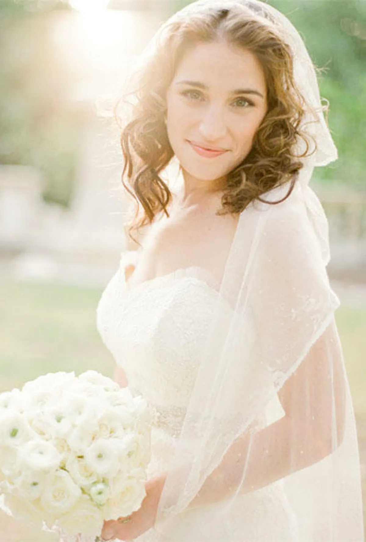 3 ـ إن كان شعرك قصيراً ومجعّداً، نشجّعك على إبقائه على طبيعته، وزيّنيه بطرحة كلاسيكيّة رومانسيّة، يُمكن أن تبدأ من أعلى التسريحة، كما لو أنّك وضعت شالاً على رأسك.