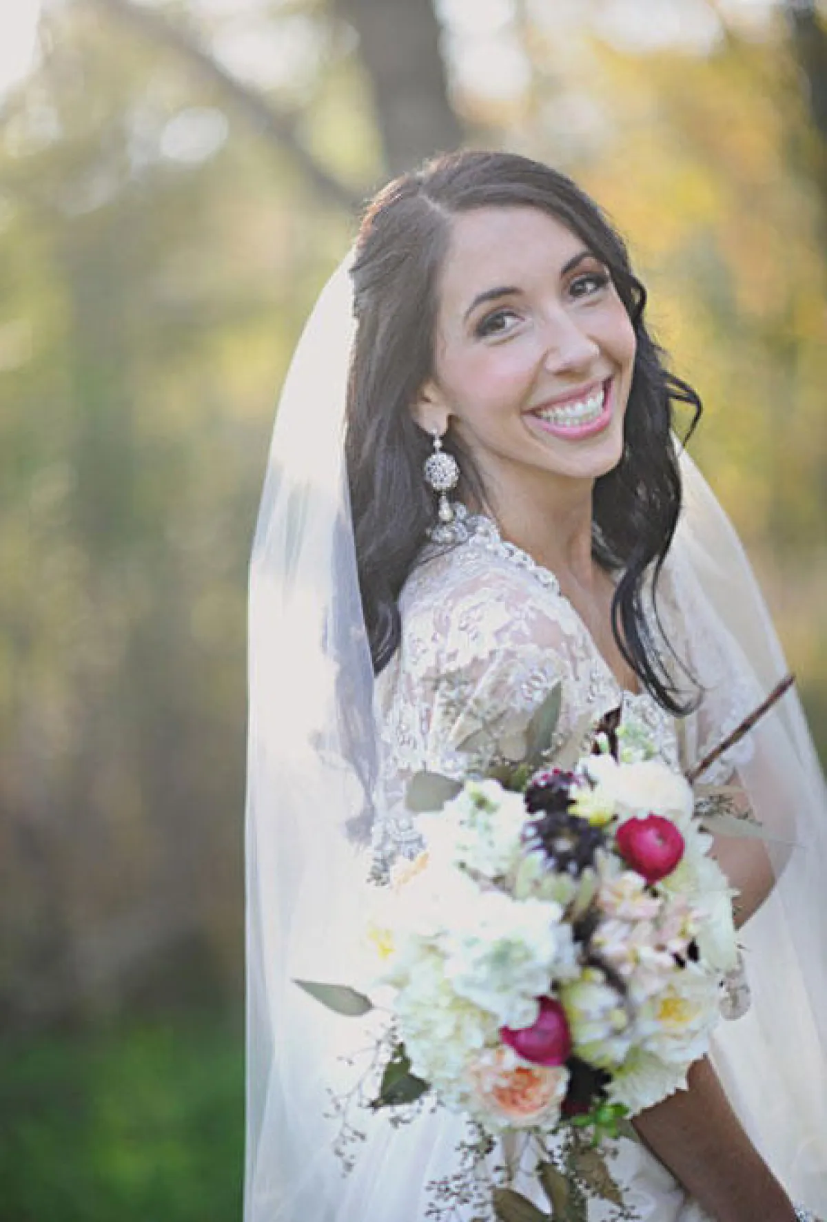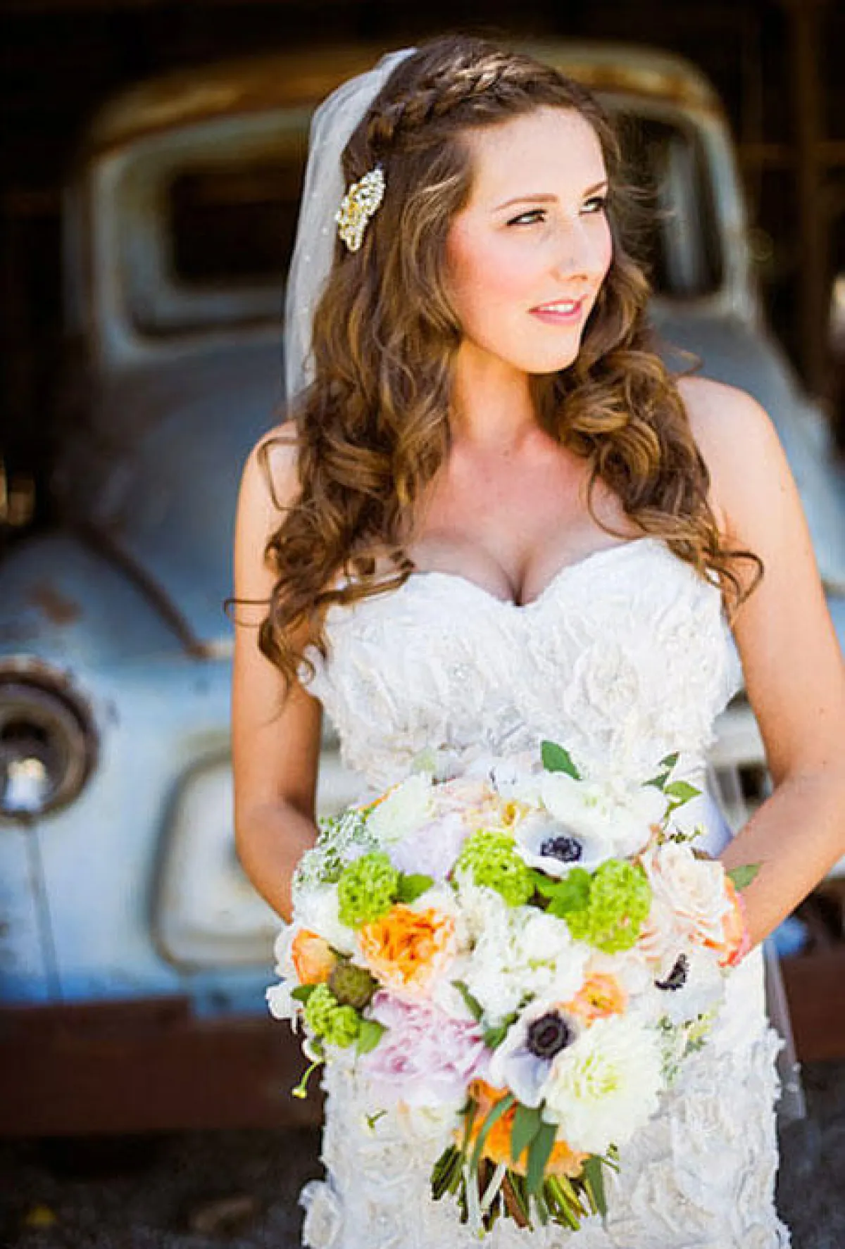 6 ـ أضفي طابعاً بوهيميّاً على طلّتك، عبر تجديل الشعر وإطلاق خصل على حدة؛ أمّا طرحة العروس فتظهر بشكل خافت من خلف بروش قديم الطراز.