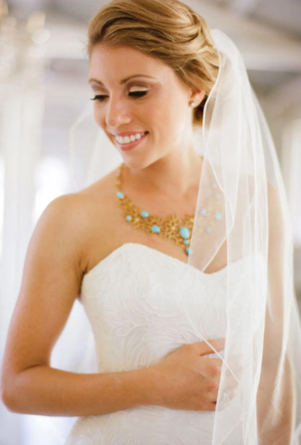4 ـ إن كان شعرك متوسّط الطول، سرّحي بعض خصل الشعر إلى الخلف، وتباهي ببعض الخصل المنسدلة، لتبقى الطرحة في وسط الرأس، ولا تنسي الأقراط الماسيّة أو الذهبيّة.