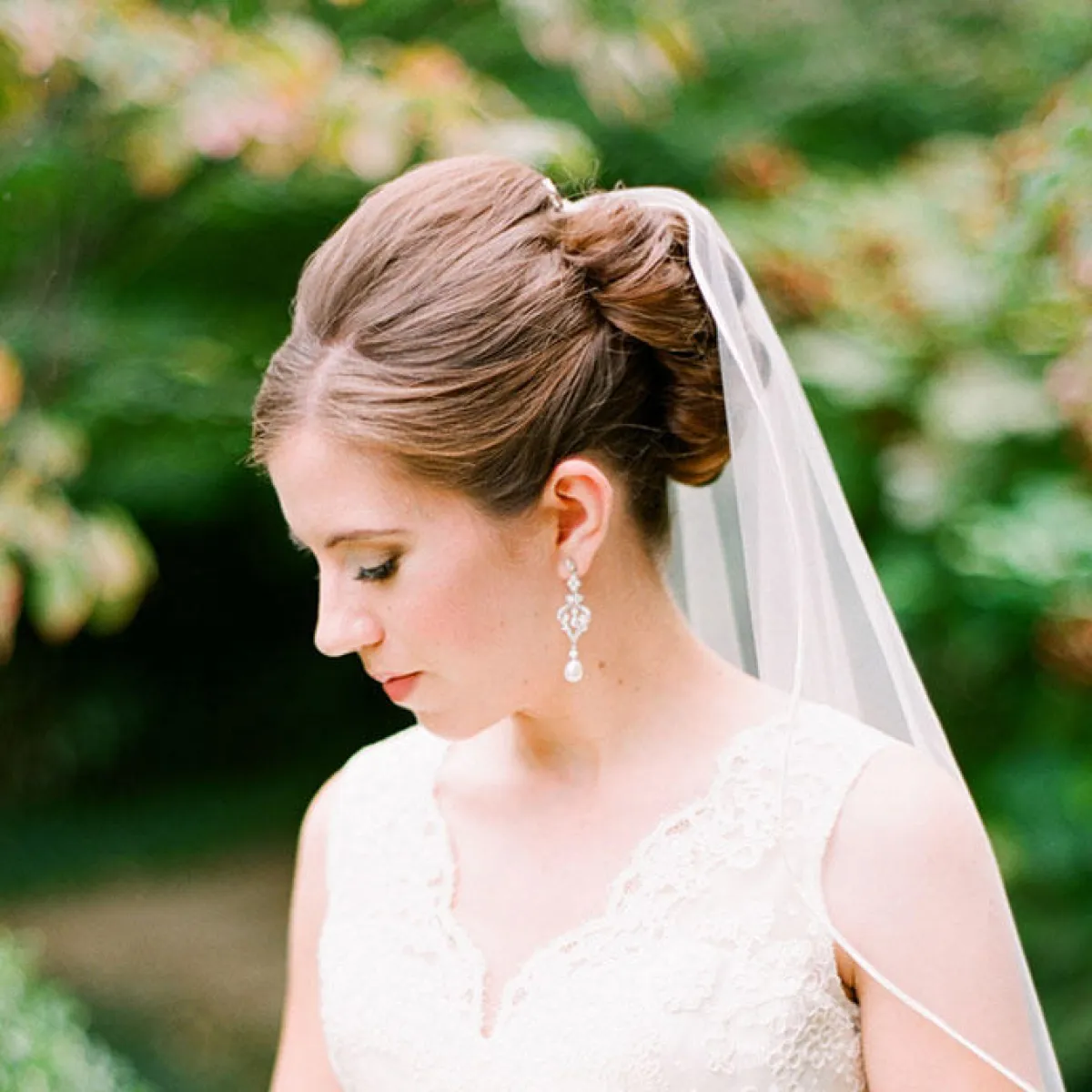 2 ـ ارفعي شعرك على شكل كعكة، ودعي الأنظار كلّها تتسمّر على وجهك الجميل. أكملي الطراز بمجوهرات لمّاعة وبسيطة، في الوقت نفسه، وضعي الطرحة في أسفل الشّعر كي تنسدل على ظهرك.