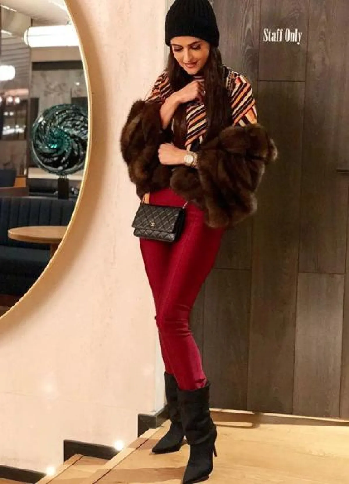 علا الفارس في بنطلون من الجلد الأحمر