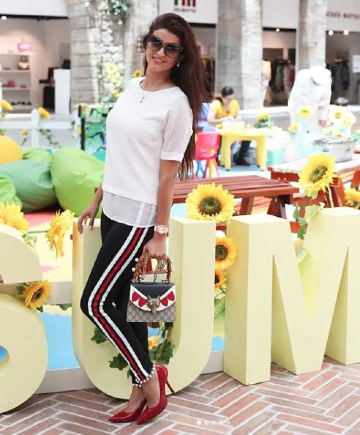 تنسيق صباحي جمع بين العصرية والأناقة اعتمدته علا الفارس، حيث نسقت بنطلونًا ذا طابع رياضي باللون الأسود، مزينًا بخطوط باللونين الأحمر والأبيض، مع توب باللون الأبيض، وحذاء بكعب عالٍ أحمر، وشنطة يد أنيقة من “غوتشي” Gucci وقد أكملت الاطلالة ببعض المجوهرات الناعمة، ونظارات شمسية ذات طابع كلاسيكي.