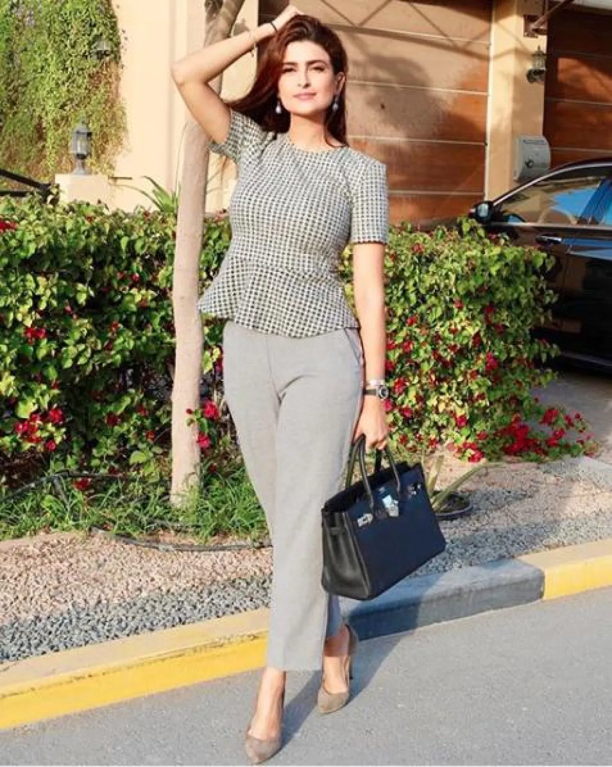 كذلك شاهدنا علا الفارس في أحد المشاوير الصباحية، وقد نسقت اطلالة أنيقة اعتمدت فيها على درجات اللون الرمادي، حيث اختارت بنطلونًا بقصة الأرجل الواسعة، وقصيرًا باللون الرمادي الفاتح، مع توب بقصة الـ peplum بنقشة الكارو، وأكملت اللوك بشنطة يد من الجلد باللون الأسود من “هرمس” Hermes، وحذاءً بكعب عالٍ باللون الرمادي أيضًا.