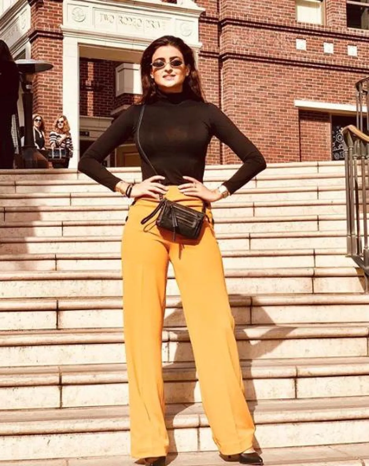 في أحدث اطلالات علا الفارس شاهدناها في لوك شبابي وعصري، اختارت فيه بنطلونًا بقصة الأرجل الواسعة باللون الأصفر، نسقت معه توب بياقة عالية باللون الأسود، وشنطة يد من الجلد بحجم صغير، وحذاءً بكعب عالٍ أنيقًا، وأكملت اللوك بنظارات شمسية مستوحاة من التسعينيات بتصميم لافت.