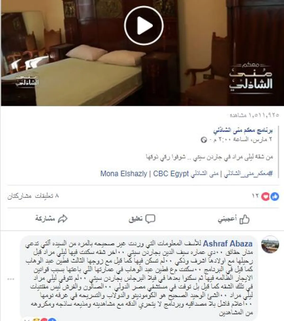 وعلق على الفيديو عبر حسابه الشخصي بموقع الفيس بوك قائلًا: للأسف المعلومات التي وردت غير صحيحة بالمرة من السيدة التي تدعى منار، حقائق: دي عمارة سيف الدين بغاردن سيتي، آخر شقة سكنت فيها ليلى مراد قبل رحيلها مع أولادها أشرف وذكي، لم تسكن فيها كما قيل مع زوجها الثالث فطين عبد الوهاب كما قيل في البرنامج، سكنت مع فطين عبد الوهاب في عمارتها اللي باعتها بسبب قوانين الإيجار الظالمة فيها، ثم سكنوا بعدها في فيلا البرجاس بغاردن سيتي.