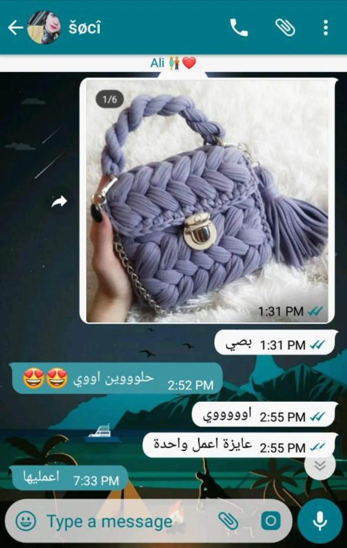 فتاة أعجبها حقائب «هاند ميد» من «الموديل الجديد»، فأرسلتها لصديقتها المقربة تقول لها: (بصي)، ردت عليها: (حلوين أوووي)، فقالت لها: (عايزة أعمل واحدة)، فردت عليها صديقتها: (اعمليها).