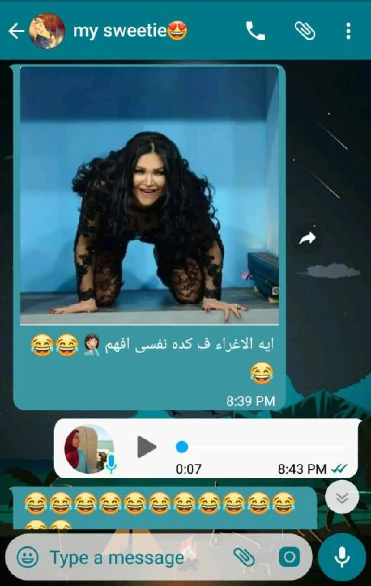 أرسلت فتاة إلى صديقتها صورة المطربة الخليجية أحلام، تقول فيها: (إيه الإغراء في كده نفسي أفهم؟!) فردت عليها صديقتها تقول: (هو فين الإغراء في كده؟ دي عاملة زي الزومبي!!) وامتلأ الشات بينهما بإيموشن الضحك!