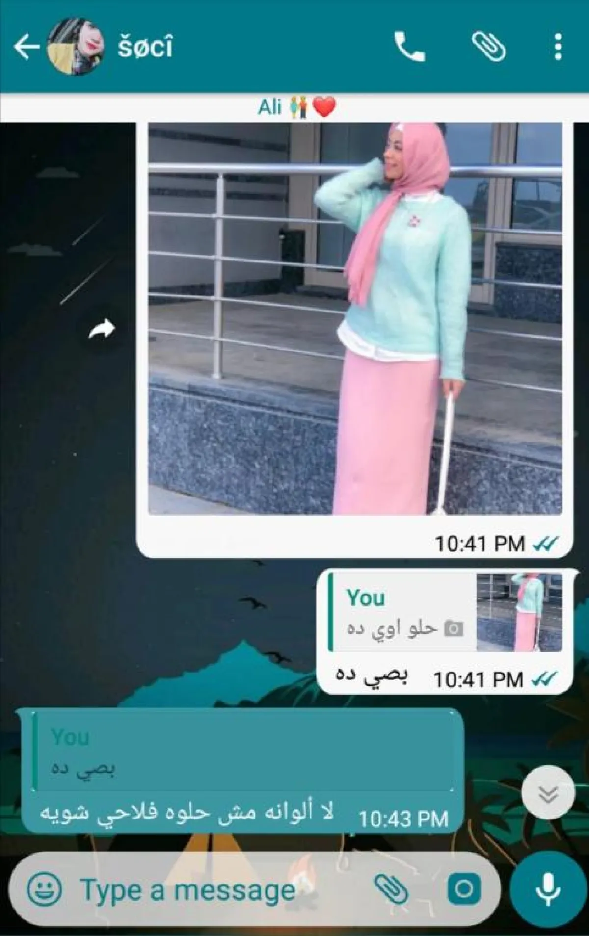 أرسلت إحداهن صورة لصديقتها؛ لتأخذ رأيها في موديل للمحجبات، تقول لها: (بصي الموديل ده؟) فردت عليها: (لا ألوانه مش حلوة.. فلاحي شوية!!) وبدأت في إرسال صورة موديلات أخرى.