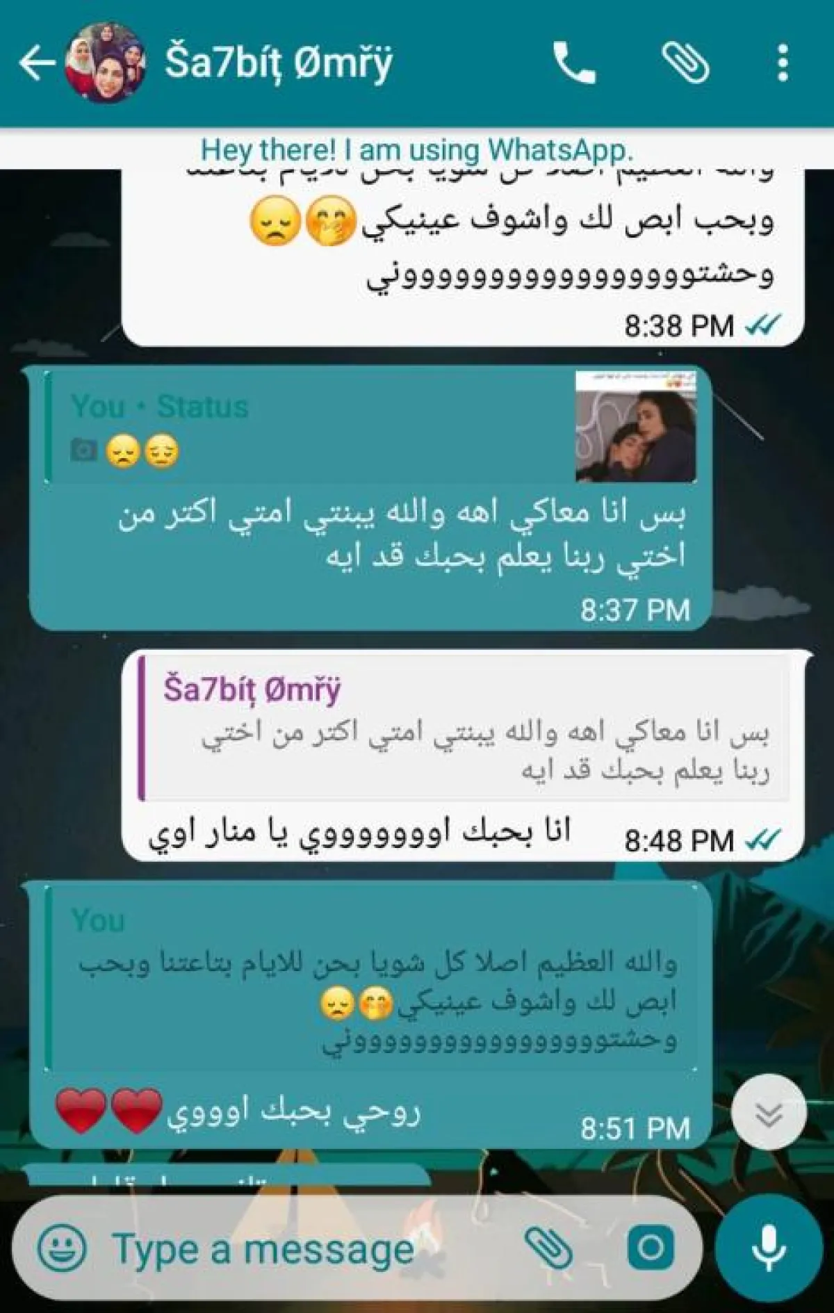 أنزلت فتاة صورة لمشهد «أبو العروسة» على «ستوري الواتس»، مكتوبًا فيها: (اللي ملهاش أخت بنت، وحيدة، حتى لو ليها مليون صاحبة) فردّت عليها صديقتها: (بس أنا معاكي.. إنتي أكتر من أختي.. ربنا يعلم بحبك قد إيه؟!).