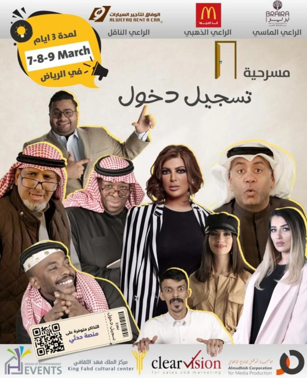 بدعم من الهيئة العامة للترفيه، يحتضن مركز الملك فهد الثقافي في الرياض المسرحية الكوميدية "تسجيل دخول"، من بطولة نخبة من نجوم المسرح والدراما في السعودية والخليج، في مقدمتهم خالد العجيرم، وأحمد العونان، وأميرة محمد، وعبدالمجيد الرهيدي، ووحيد العبدالله، ولمياء عبدالعزيز، وسامر الخال، وسمر المير، وراشد المدهش، وتأليف سعد المدهش، وإخراج زكريا المؤمن.