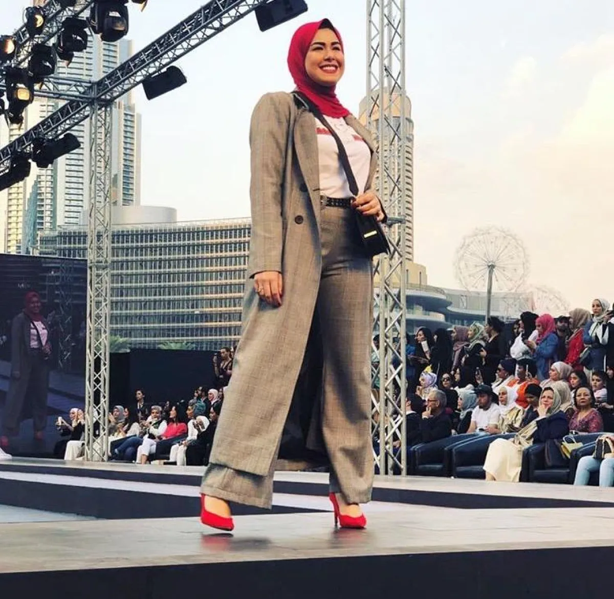 لفتنا أيضًا طريقة اختيارها للـ أحذية ذات الكعب السميك، لتبدو مريحة وكذلك أنيقة وعملية، كما أنها تركز على الألوان الجريئة كالميتالك واللون الأحمر.