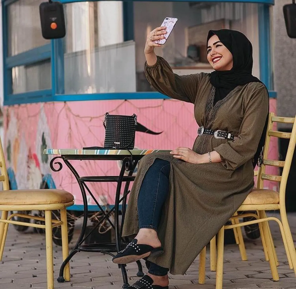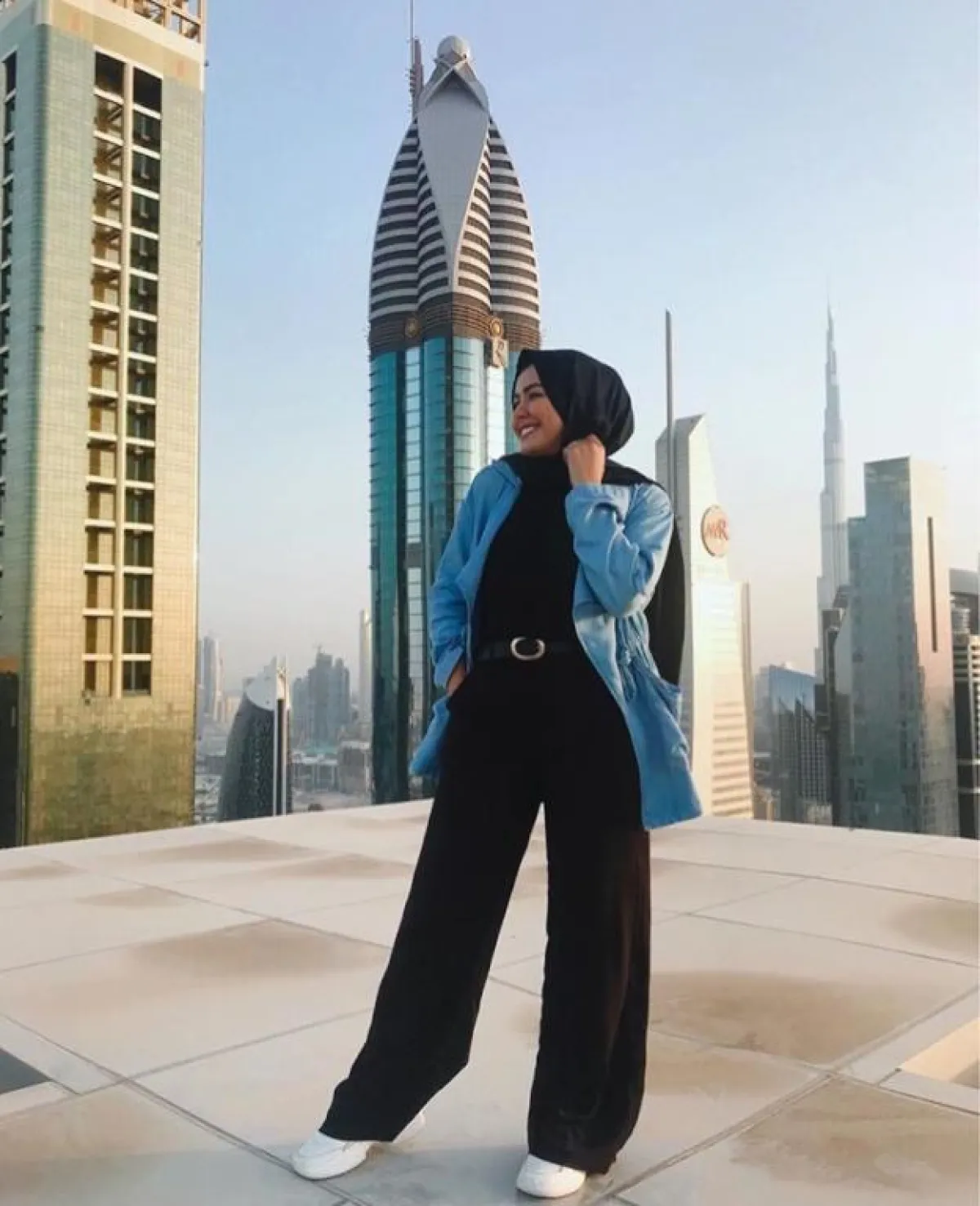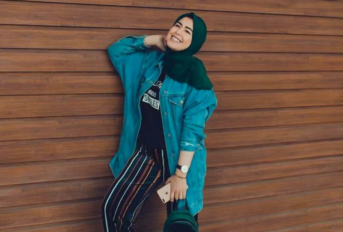 الجاكيت الجينز الطويل أساسي بخزانة المحجبات، لهذا تعتمد عليه مروة بشكل كبير، تنسقه مع البناطيل المخططة بالطول لـ اطلالة كاجوال وعصرية، مع توب أسود.