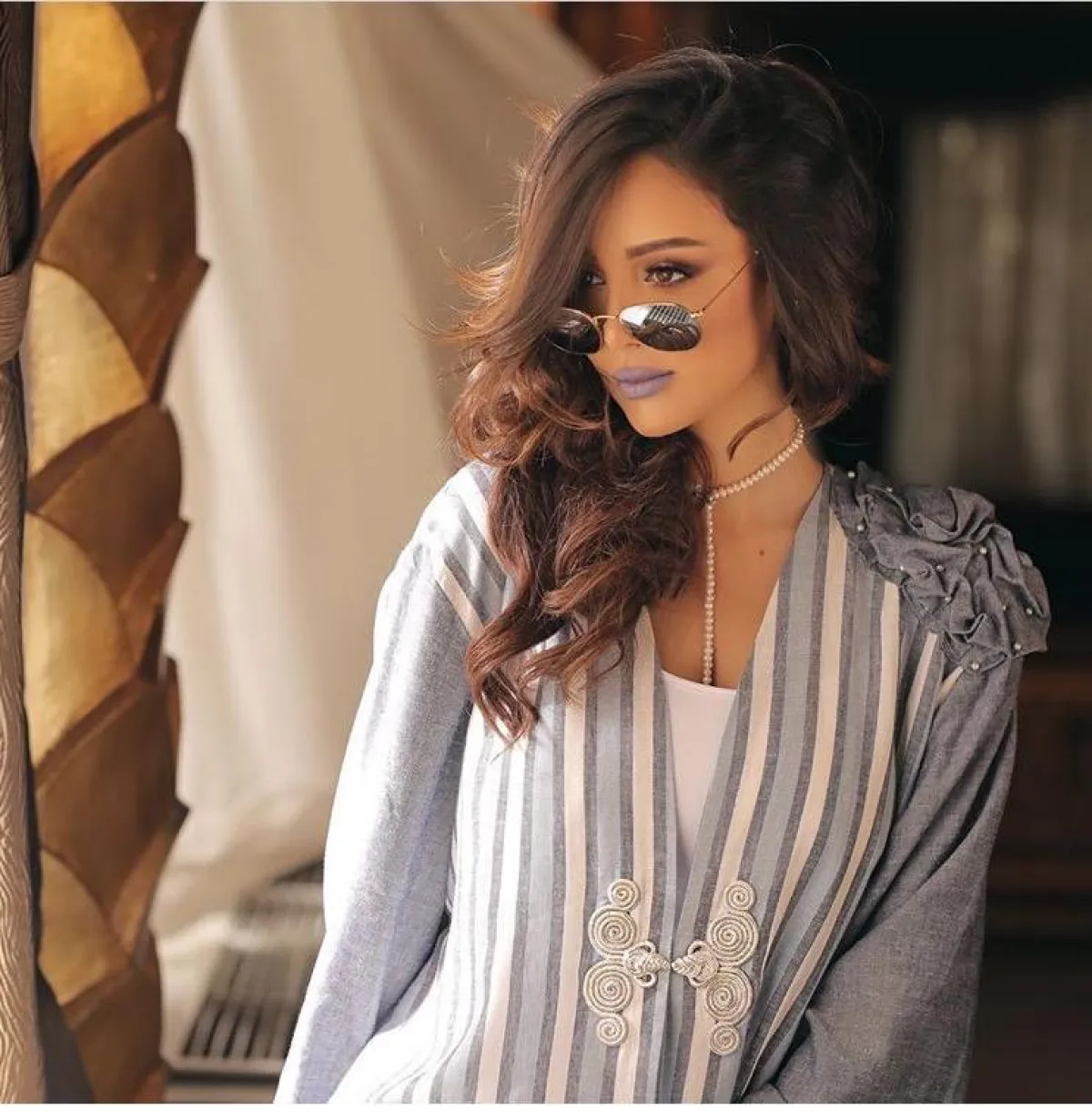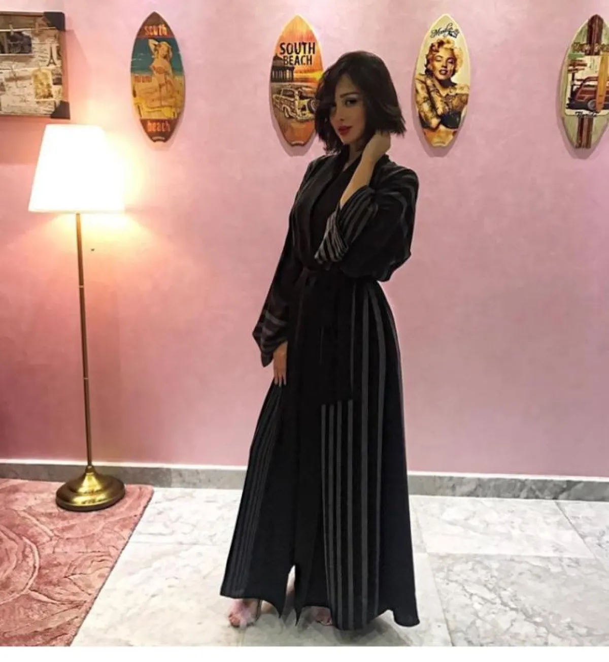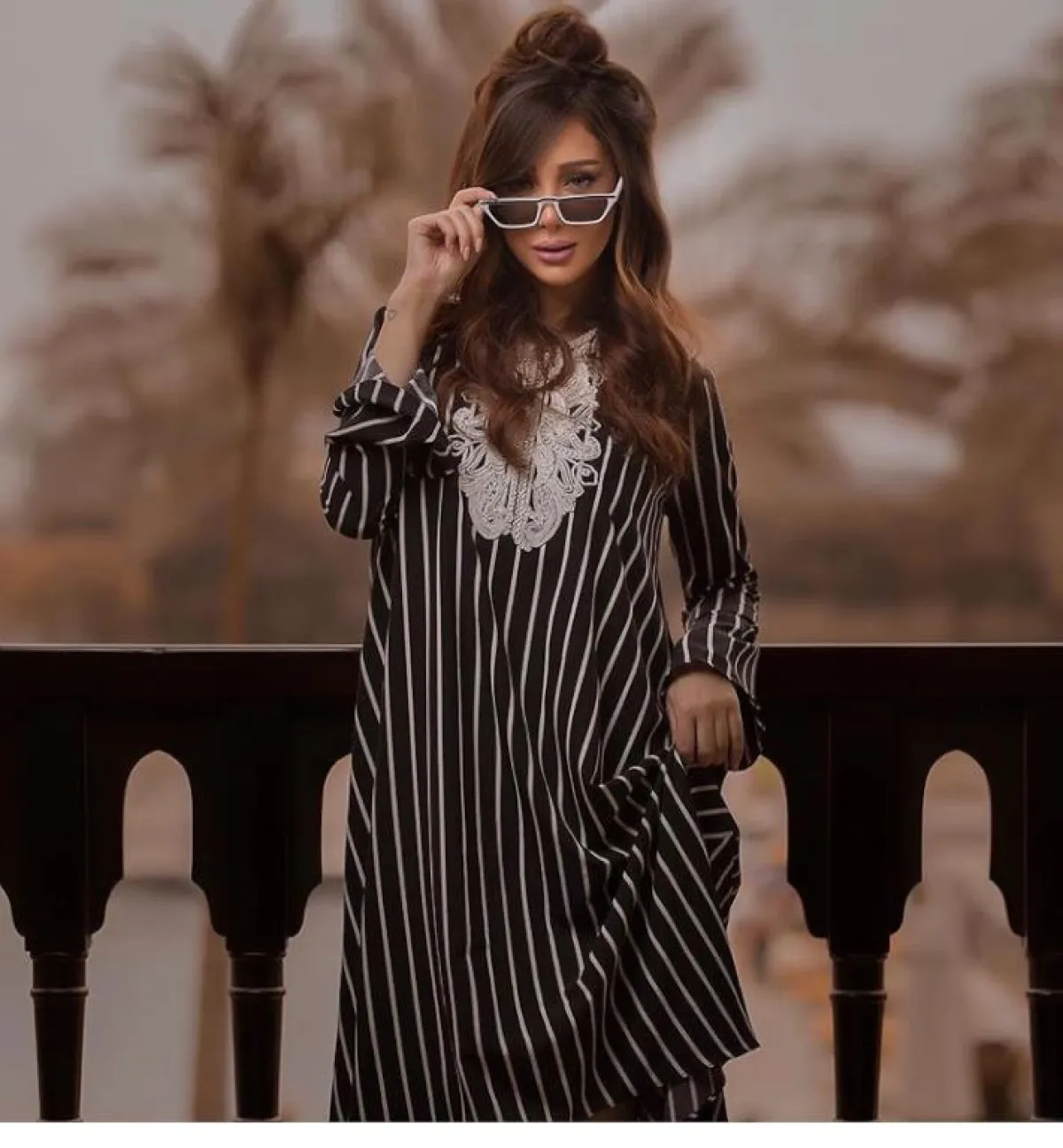 ولكن في الأيام البسيطة العادية، لا تتخلى بسمة أيضًا عن فكرة العبايات والقفطاين، كـ القفطان باللون الأسود مع بعض خطوط الطول من الطول نفسه، زادتها طولًا وأناقة.