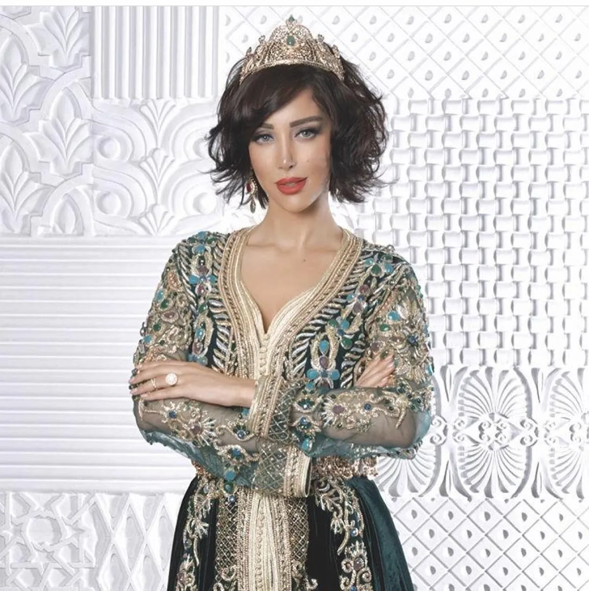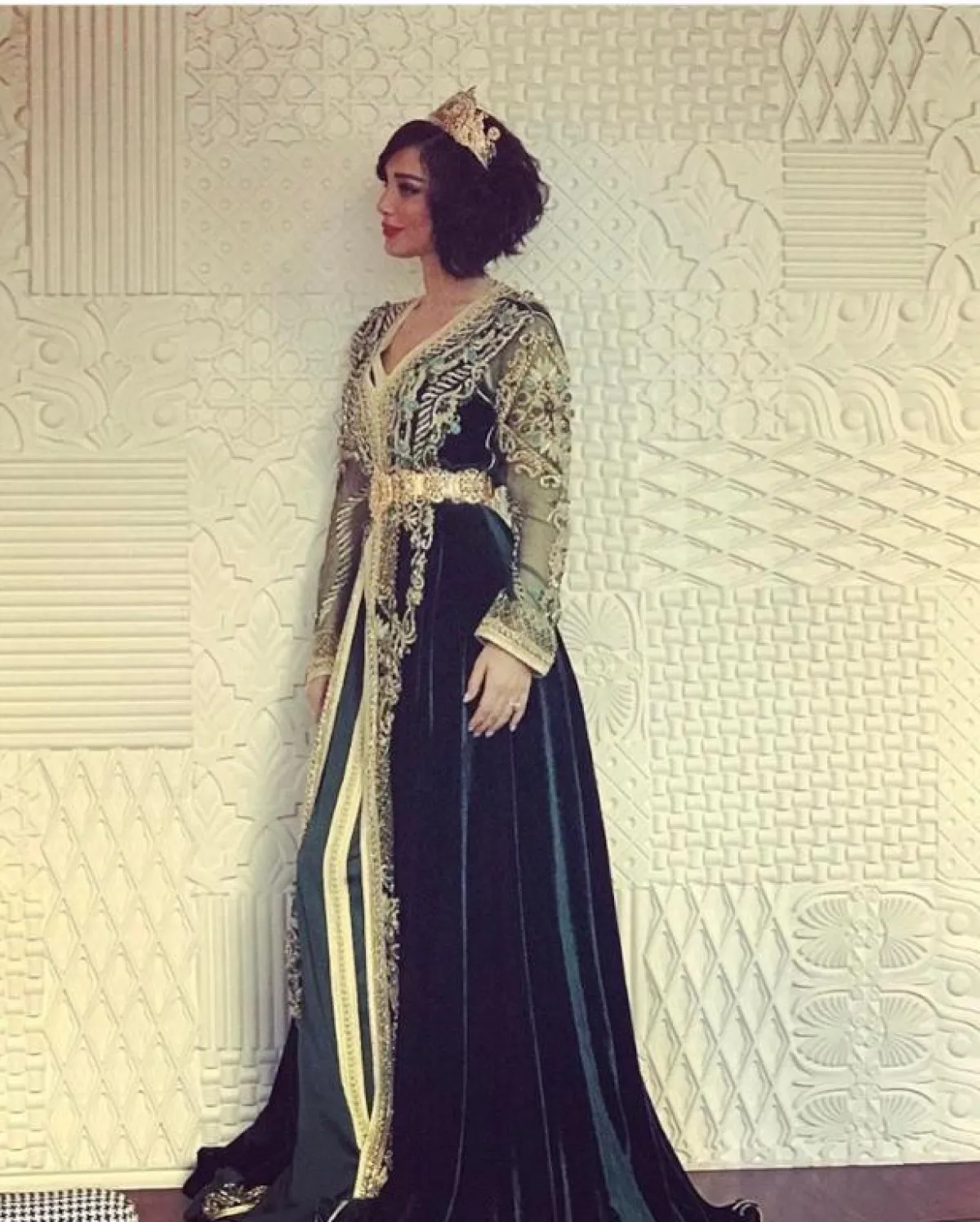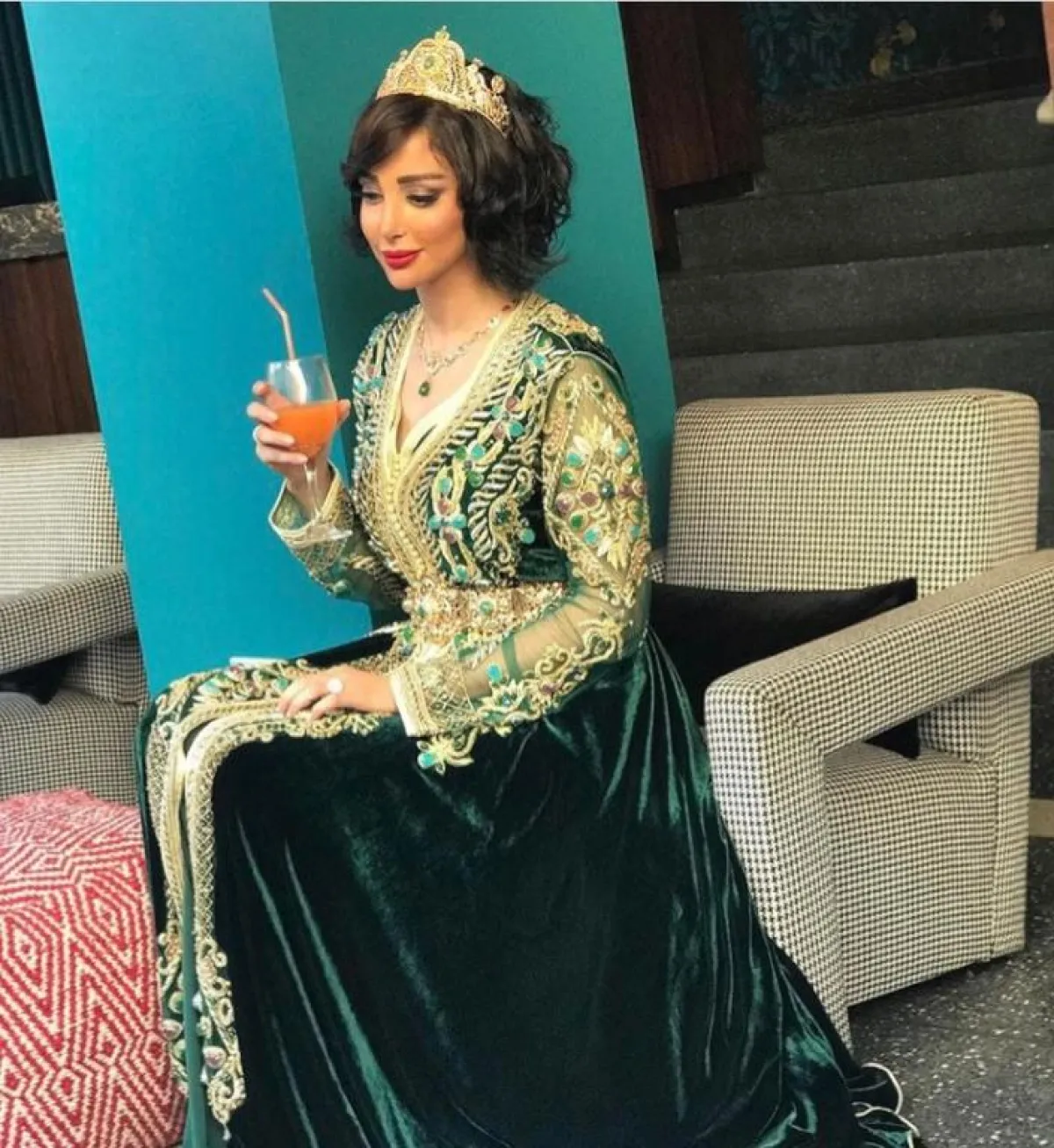 وبالرغم من حبها للذوق البسيط الناعم، لا يمكنها ألا ترتدي القفطاين بالشكل التقليدي المعروف، كالقفطان المترف بخامة الفيلفت باللون الاخضر العشبي، المطرز بالخرز والخيوط الذهبية، مع الحزام الفخم العريض.