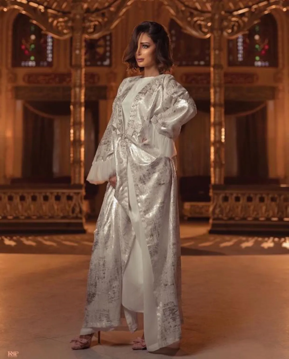 أما إن كنتِ تحبين بعض اللمسات الخاطفة للأنظار، فهذا القفطان العباية باللون الأبيض بخامة لامعة ميتالك، مع أكمام منفوشة من التول، سيعجبكِ كثيرًا، ويصنّف أكثر كـ عباية استقبال لضيوفكِ بحفلاتكِ الفخمة.