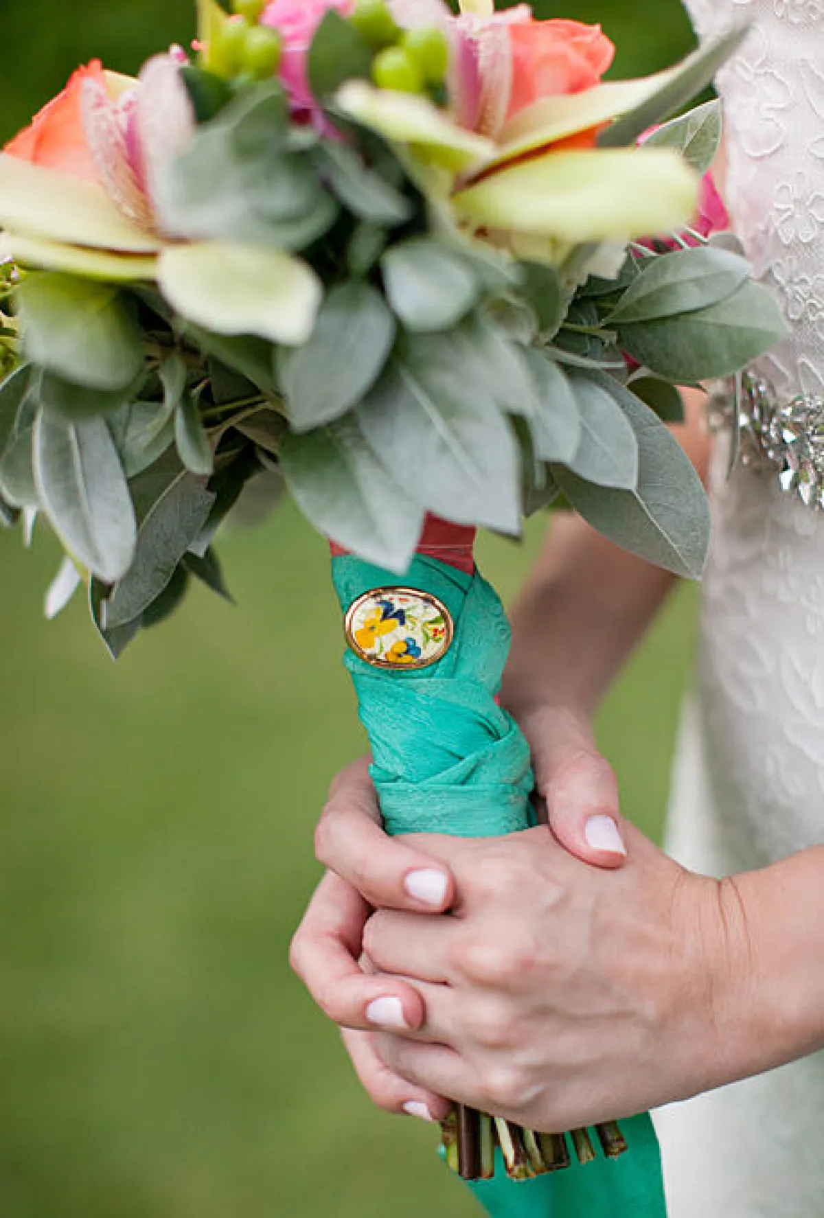 4 ـ إن كنت تقيمين زفافك على جزيرة أو شاطئ، أو اخترت باقة ورود ملوّنة وجريئة مثلاً، لفّي الباقة بشريط أزرق، وزيّنيه بـ"بروش" لإضفاء لمسة أناقة عليه.