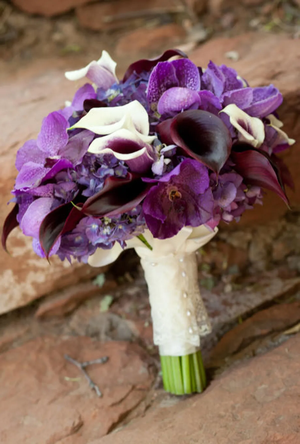 5 ـ تحبّ كلّ عروس اللون البنفسجيّ، فاختاري ـ بالتالي ـ ورود الأوركيد البنفسجيّة في باقتك، وغلّفي الجذوع بقطعة قماش من الدانتيل، وثبّتيها بشريط أبيض.