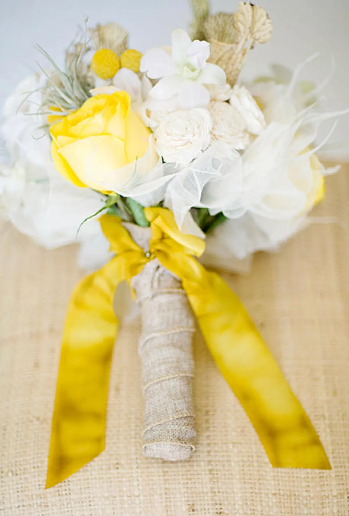 6 ـ اجعلي الزنابق المجفّفة والأوركيد والورود الصفراء في باقتك، إلا أنّ الشريط الحريريّ يزيدها جمالاً ونعومة.