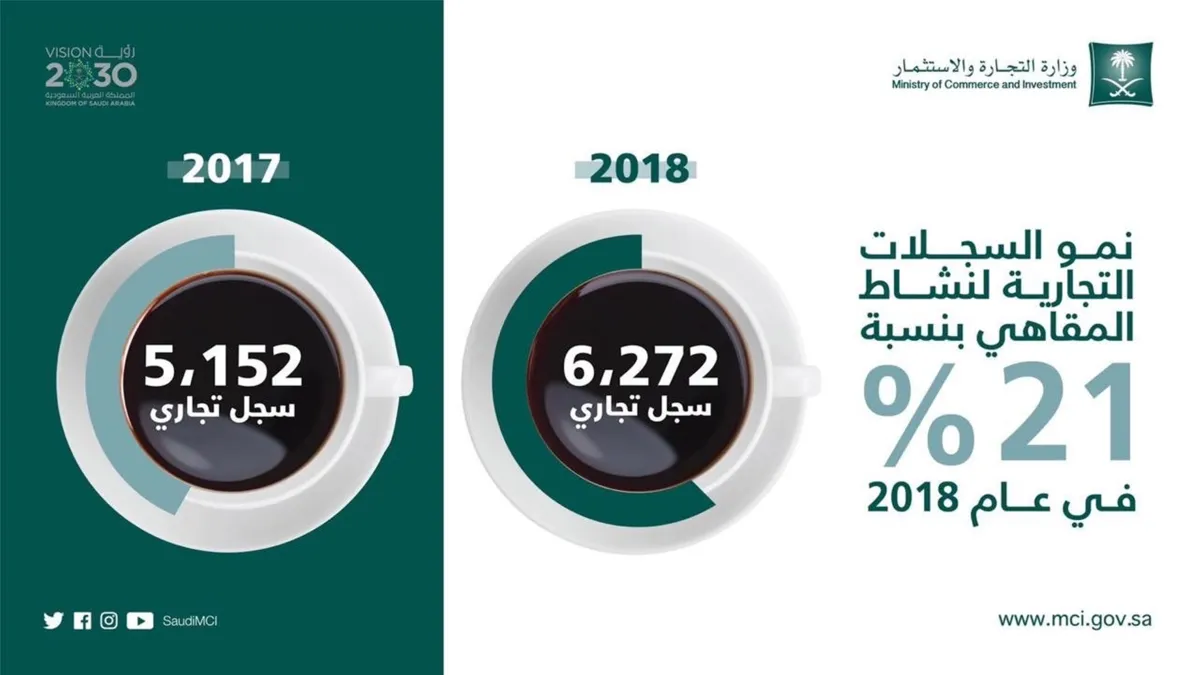 كشف المتحدث الرسمي لوزارة التجارة والاستثمار عبد الرحمن الحسين، عن عدد السجلات التجارية المصدرة للمقاهي خلال عام 2018 حيث بلغ 6,272 سجل تجاري في مختلف مناطق المملكة، محققاً نمو بنسبة 21٪ عن أعداد سجلات عام 2017 المصدرة للمقاهي وعددها 5,152 سجل.