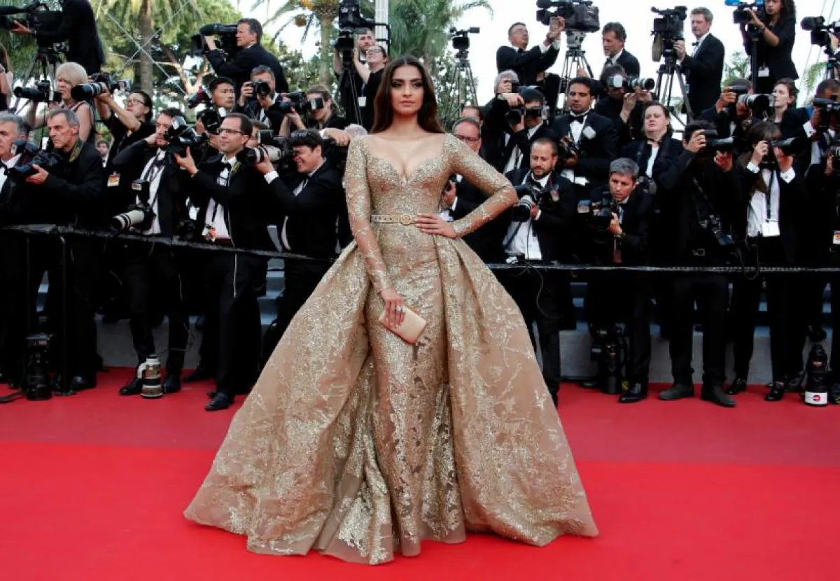 دائمًا ما تتألق سونام كابور Sonam Kapoor بأجمل الاطلالات على سجادة مهرجان كان الحمراء، وهذه الاطلالة الذهبية التي حملت توقيع “إيلي صعب” Elie Saab التي اختارتها العام الماضي، كانت من الأجمل، حيث بدت فيها مثل الملكات وقد ناسبها لون الفستان وقصته بشكل كبير.