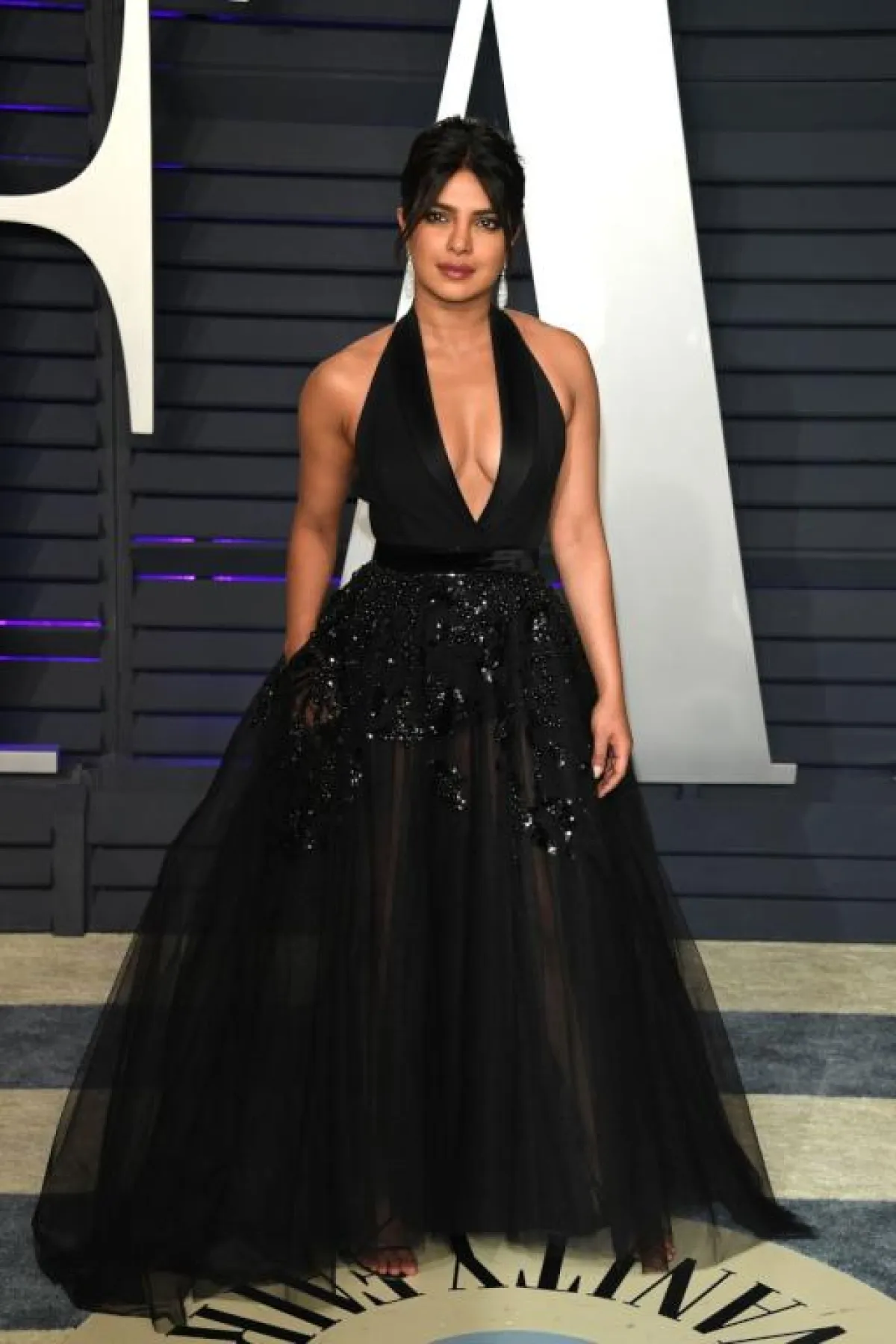 في حفل الـ Vanity Fair هذا العام، شاهدنا “بريانكا شوبرا” Priyanka Chopra وقد تألقت في فستان سهرة فاخر باللون الأسود اختارته من “إيلي صعب” Elie Saab، تصميمه أنثوي وجذاب، ياقته مفتوحة على شكل حرف V وتنورته منفوشة ومصنوعة من التول المطرز بحبات الترتر البراقة، وقد بدت أنيقة ولافتة.