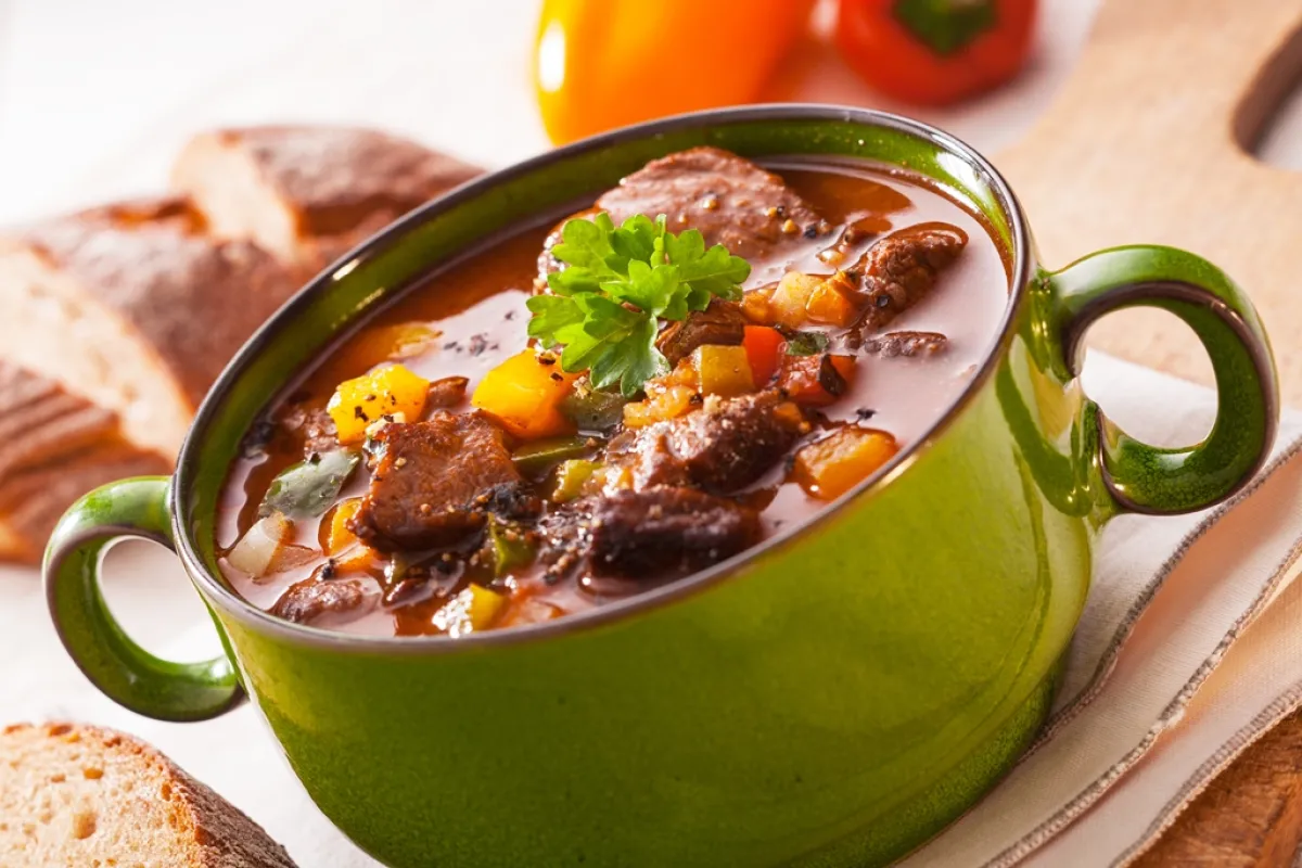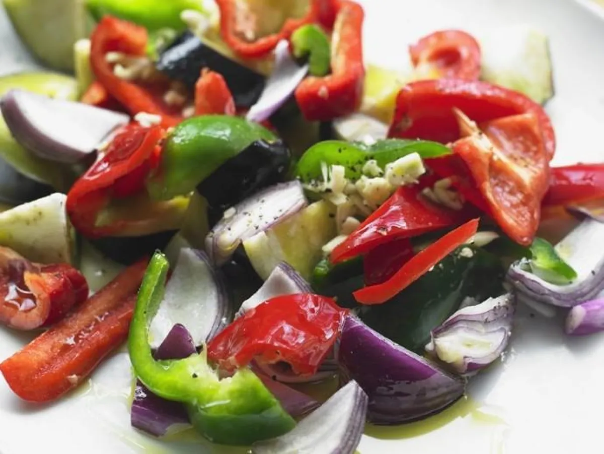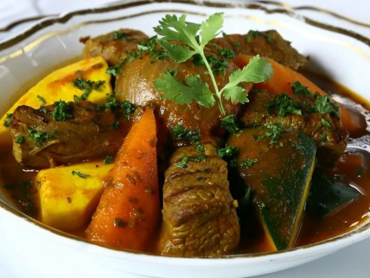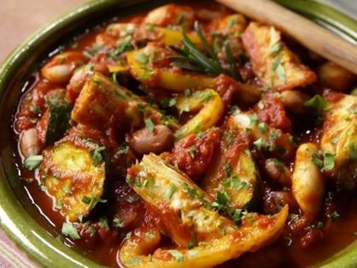 1-يقطع البصل ويوضع في قدر الطهو مع الزيت النباتي وزيت الزيتون ويحمر حتى يكتسب اللون البني، نضيف الثوم واللحم المقطع «أصابع»، ثم الطماطم المقطعة إلى مكعبات صغيرة والكوسا والفلفل الرومي.