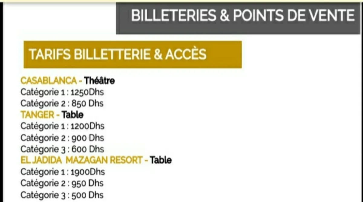 وتتراوح أسعاء تذاكر الحفل الذي تحييه الديفا في مسرح "استوديو الفنون الحية" بالدار البيضاء يوم 23 أبريل المقبل، ما بين 850 و1250 درهمًا، في حين حُدّد ثمن تذاكر حفلها المنتظر تنظيمه بقصر الأنوار بطنجة يوم 27 من الشهر ذاته، ما بين 600 و 1200 درهم، وبمنتجع مازاغان يوم 30 أبريل مقابل 500 و 1900 درهم.