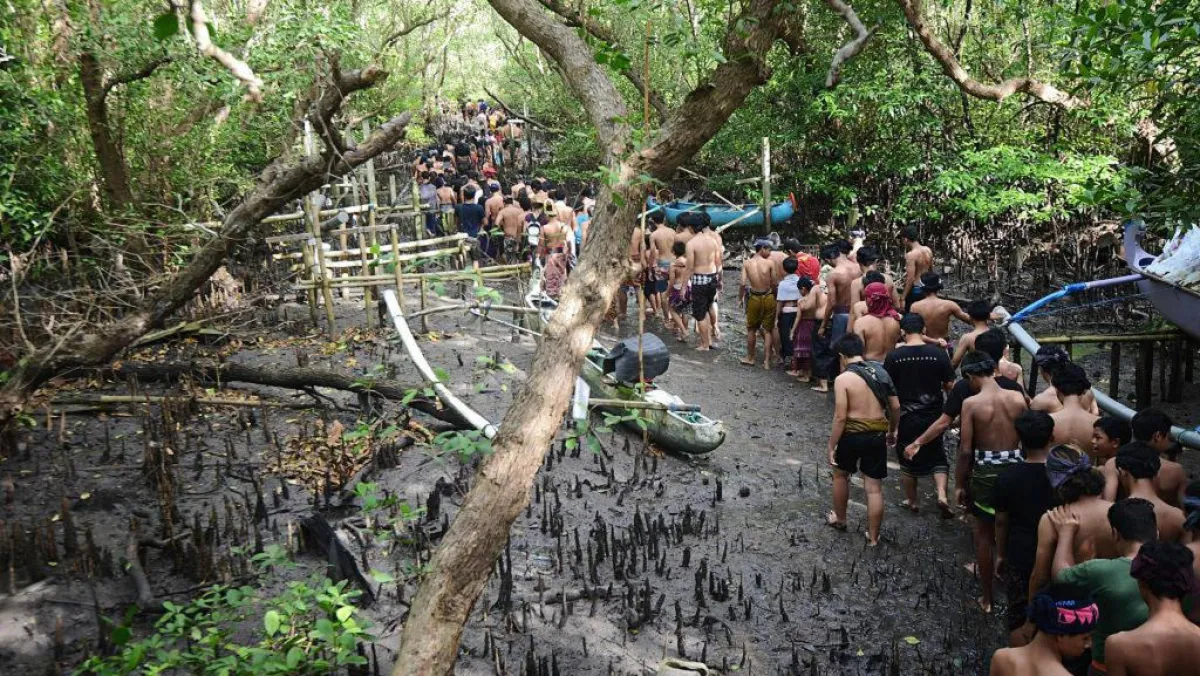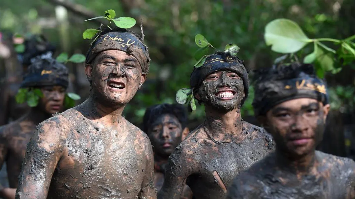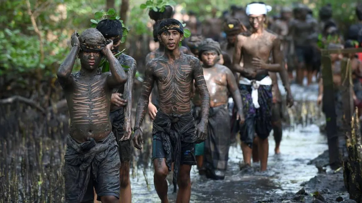 في طقس يقوم به سكان قرية دينونجانان الإندونيسية. مئات من الرجال، السيدات، والأطفال يغمسون أنفسهم في الطين لتطهير أنفسهم من الأرواح الشريرة. وبحسب موقع «CGTN» في الاعتقاد المُسمى بـ«ميبوج بوجان» يقوم سكان قرية دينونجانان الإندونيسية بعمل حمام طين يُعتقد أنه يساعد الناس في طرد الأرواح الشريرة، وضغوط الحياة والطاقة السلبية. فيقوم السكان المحليون بالمشي بين أشجار المانجاروف ليجمعوا كميات من الطين ويغمسوا بها أنفسهم، ثم يذهبوا لأقرب شاطئ مشمس وأجسامهم مغطاة بالطين ليس فقط ليغتسلوا من الطين، لكن أيضاً ليغسلوا أنفسهم من الطاقة السلبية أو أي حظ سيِّئ.