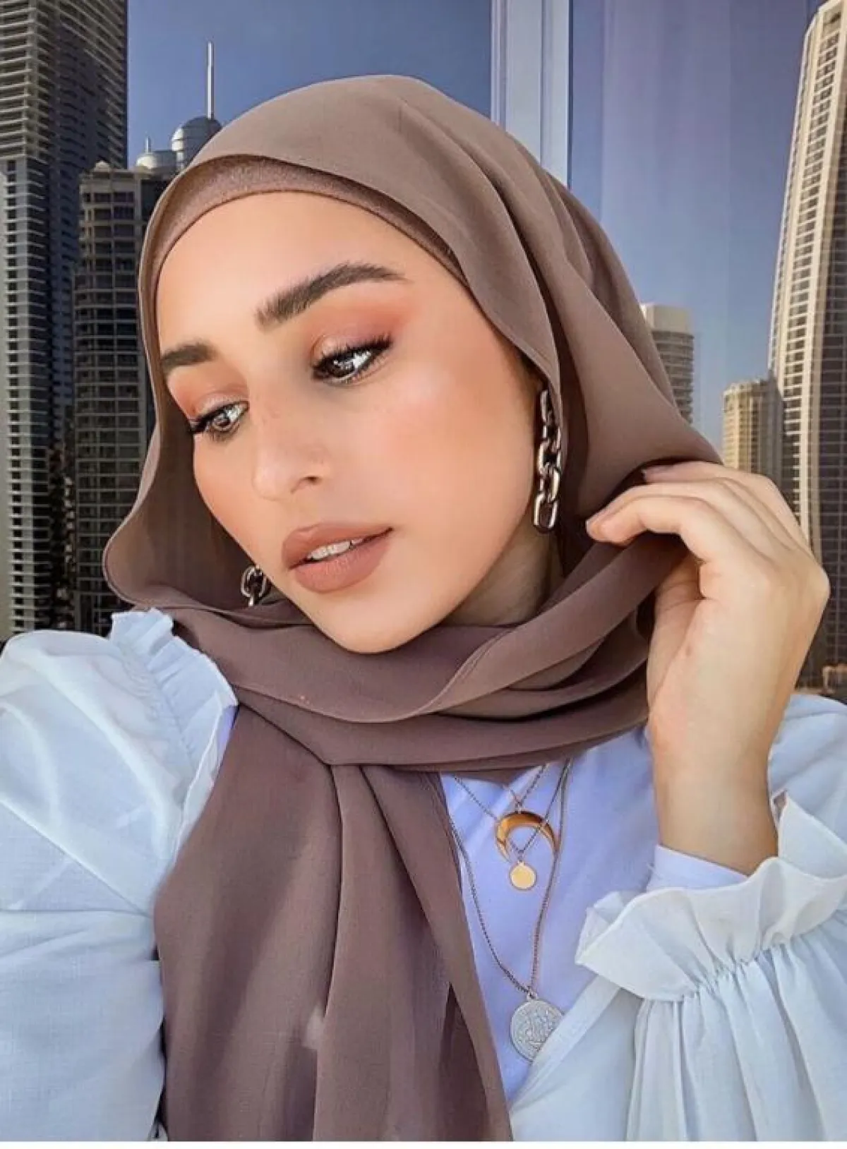 أما إذا كنتِ ستعتمدين على خامات الشيفون مثلًا، فالأفضل أن تضعي بطانة قطنية للحفاظ على بشرتكِ وشعركِ من أيّ نوع من الحساسية، بخاصة مع ساعات العمل الطويلة، ولف الحجاب بطريقة عشوائية وانسيابية أكثر، وكلما كان وجهكِ ممتلئًا، حاولي أن يكون الحجاب للأمام أكثر ليغطي وجنتَيْكِ.