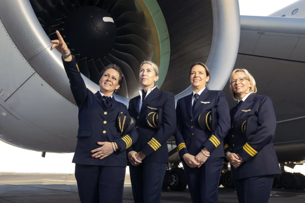 قادت الطائرة، طراز إيرباص A380، الكابتن "صوفي بلانكارد"، فرنسية الجنسية، إلى جانب زميلتها الكابتن "فايلا ستيفنسن"، الإيرلندية، ومساعد طيار أول، "بيري سوزانا ليسه"، الفنلندية، و"ليزبيث بولدوين"، البلجيكية، وعمل فريق قمرة القيادة يدًا بيد مع طاقم ضيافة جوية ضمَّ 19 مضيفة، ينتمين إلى 13 جنسية، على الرحلة التي نقلت 398 ضيفًا.