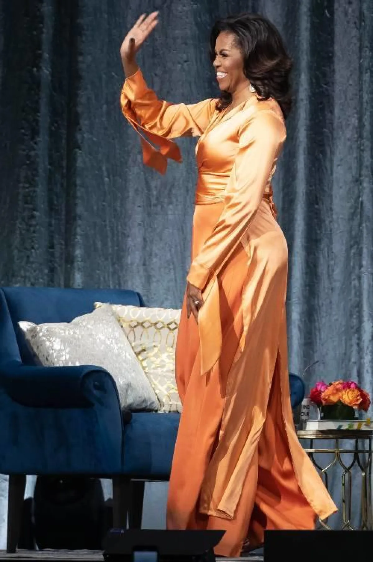 إذا كان اعتماد لون مضيء في حد ذاته يعدّ اختيارًا جريئًا، فإنّ مزجه بخامة لماعة مثل الحرير، يعلن عن امرأة لا تخشى الصيحات القوية، وهي الرسالة التي وصلت بعد أن ظهرت ميشيل أوباما بـ فستان ماكسي حرير باللون البرتقالي الساطع.