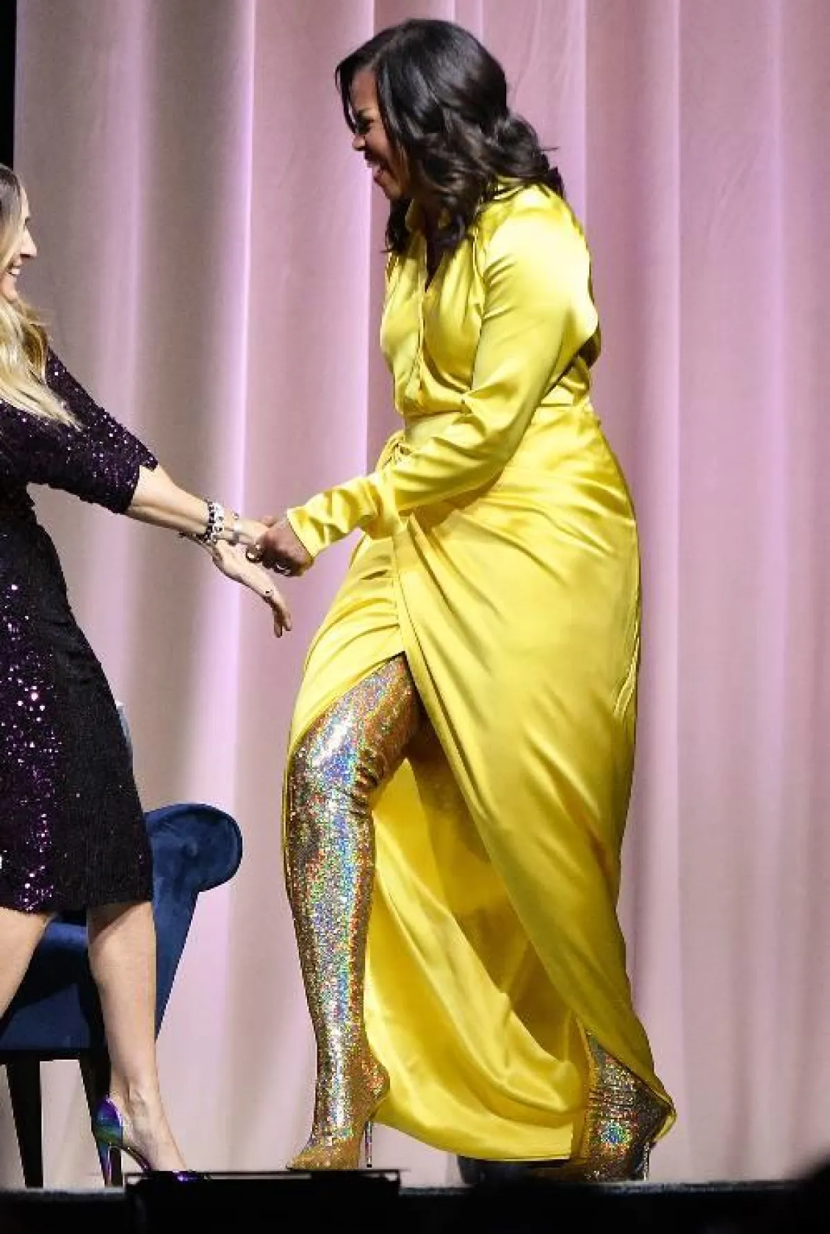 أول صيحة لفتت انتباهنا إلى تغيير أسلوب ميشيل أوباما في الأزياء، كان بوت مصمّمًا من وميض الغليتر، ومزدانًا بعنق طويل امتد إلى الفخذين، البوت ضمن تشكيلة علامة بالنسياغا. نسقته "أوباما" مع فستان أصفر ساطع من الحرير، بشق أمامي كشف عن طول عنق البوت.