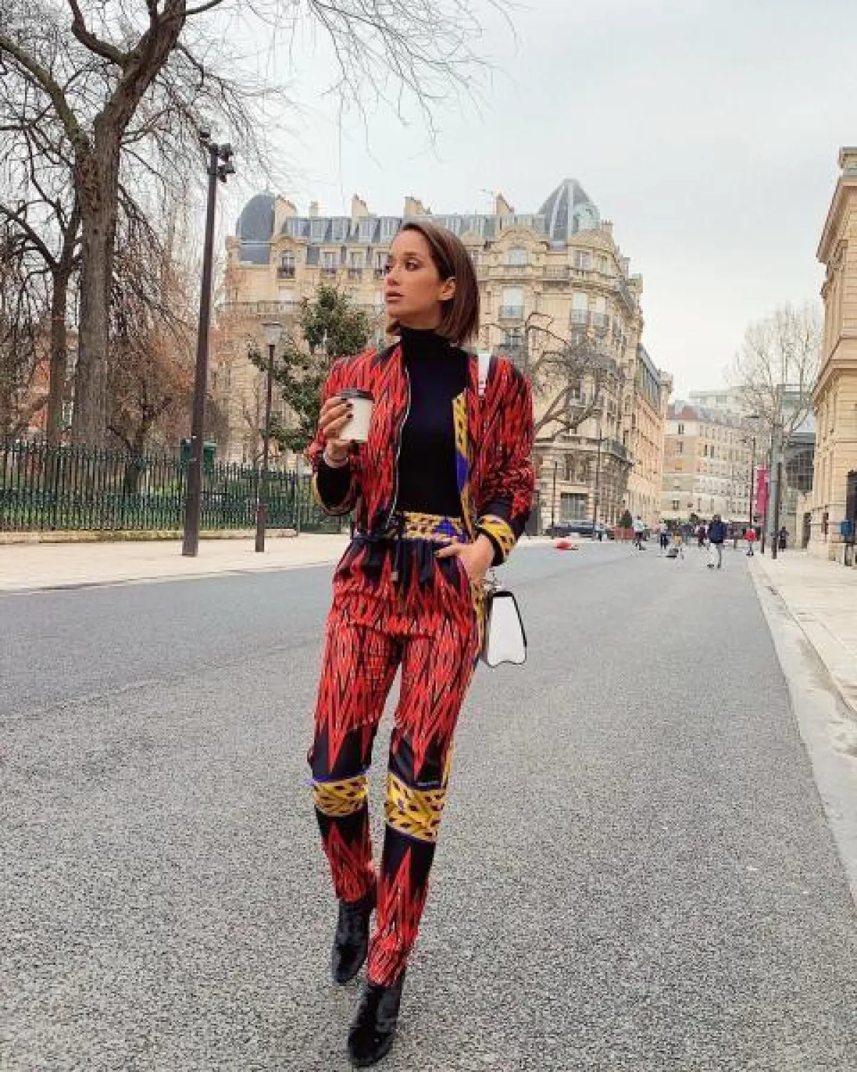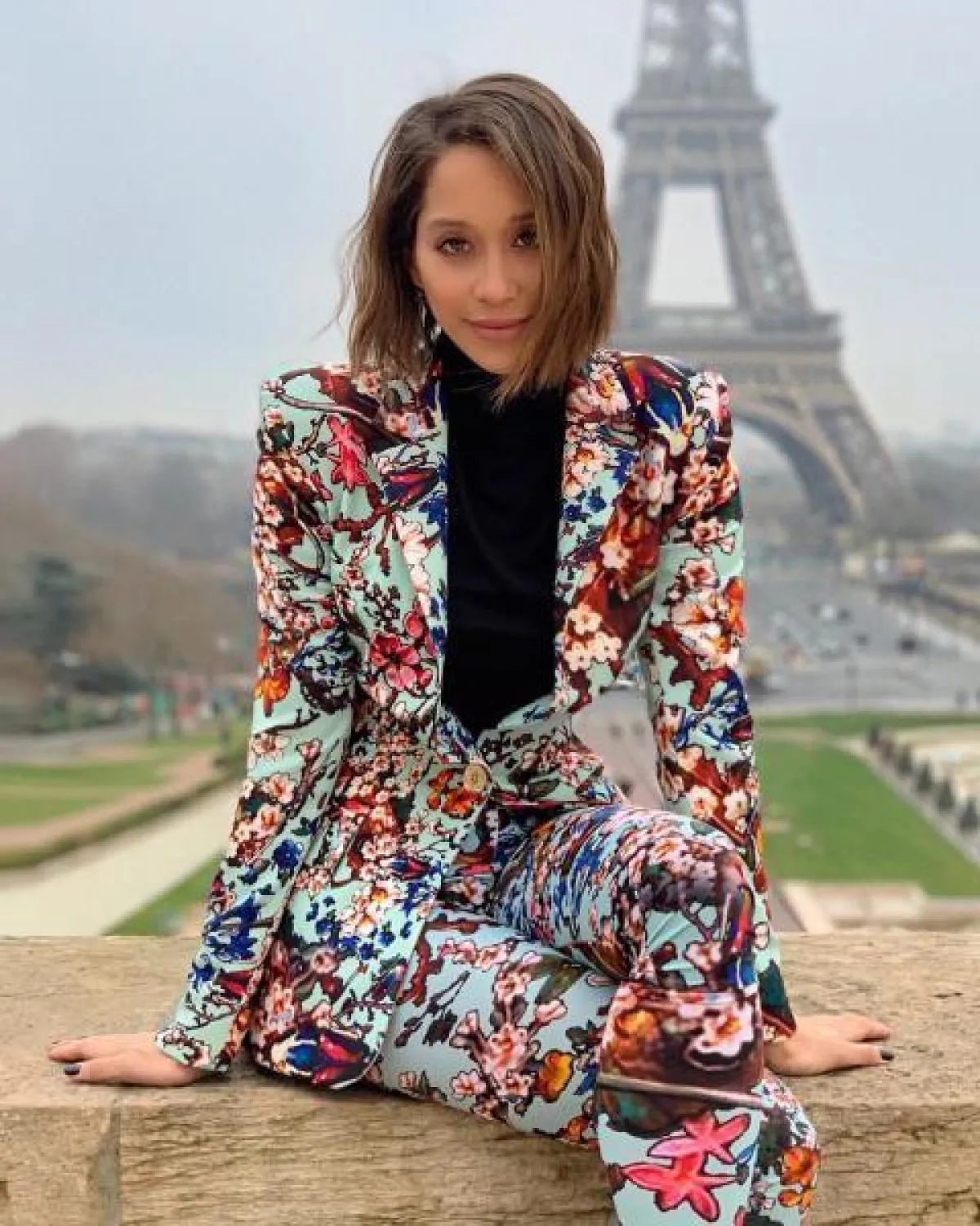 يمكنك أيضًا اعتماد بدلة بدرجة من الباستيل مثل الروسية ميرو دوما، واحدة من رائدات الأعمال في مجالي الموضة، التي اعتمدت بدلة باللون السماوي، كذلك اختارت تصميمًا مزدانًا بـ سروال منسدل بأرجل فضفاضة.