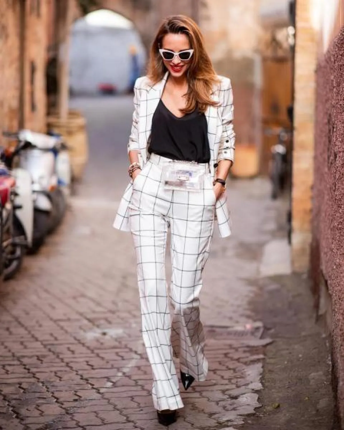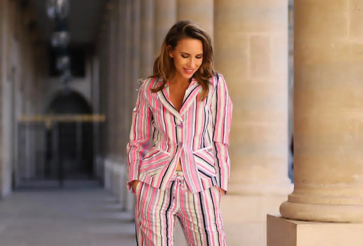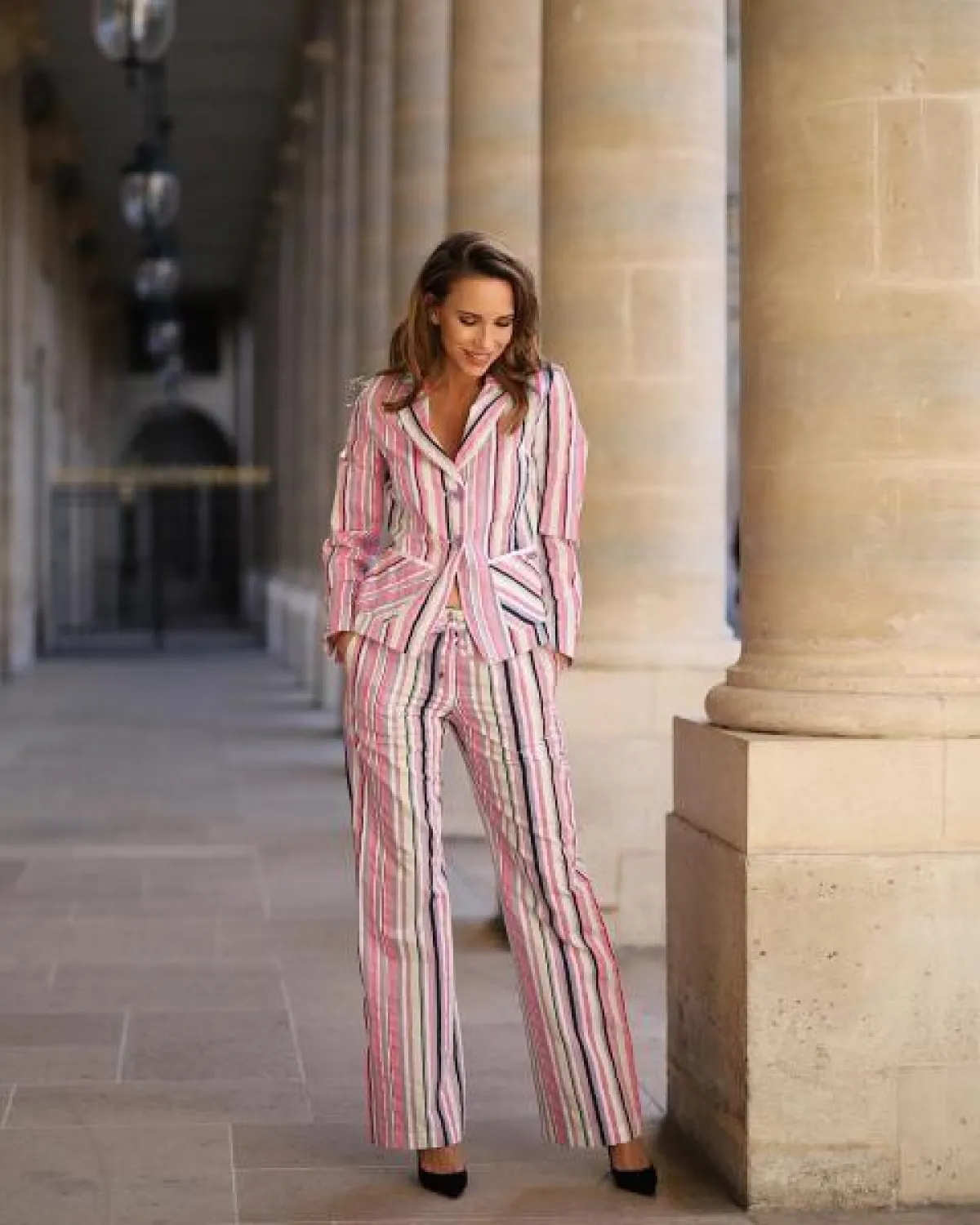 الشكل الثالث الذي صعد إلى واجهة الموضة هذا العام هي البدلات المصممة من أقمشة مطبوعة بخطوط عمودية مثل البدلة التي اعتمدتها المدونة الكسندرا لاب بظلال من الزهري.