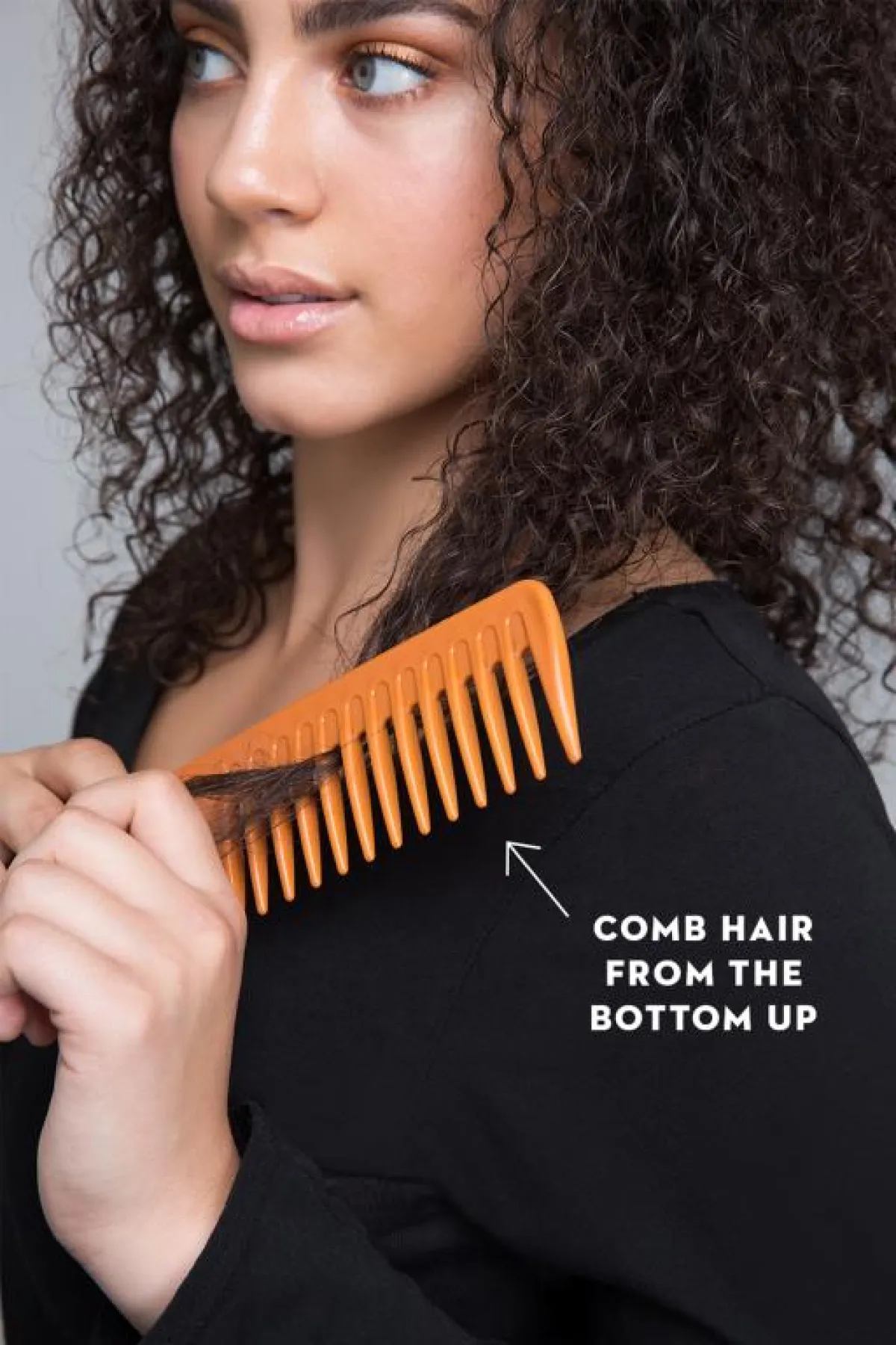 1- تمشيط الشعر من الأسفل إلى الأعلى: حيث يمكن تمشيط الشعر بهذه الطريقة من حل العقد والتشابكات التي يواجهها الشعر المجعد بشكل كبير.
