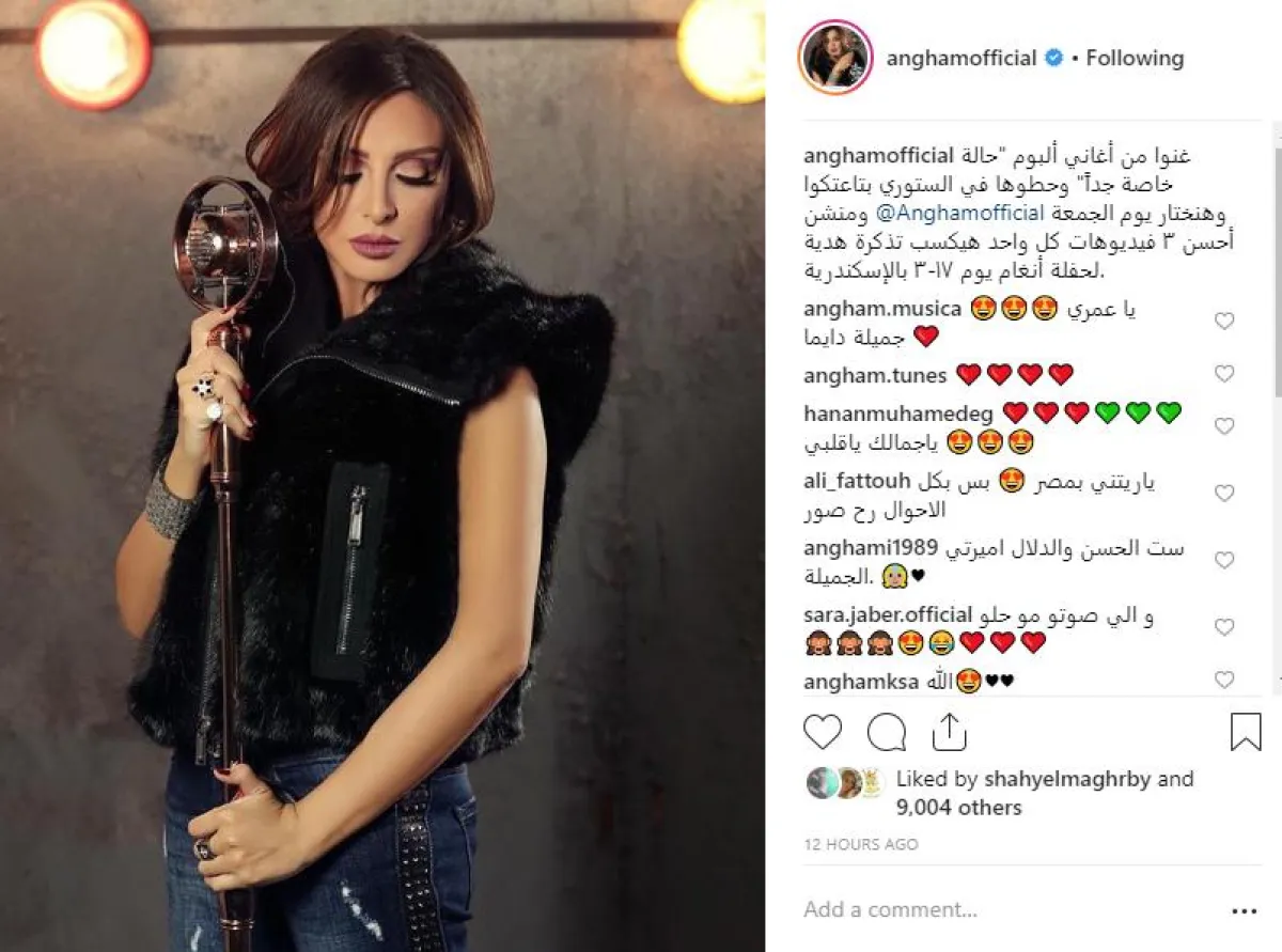 أطلقت المطربة المصرية أنغام، مسابقة لجمهورها ومتابعيها عبر موقع انستقرام، وطالبتهم بغناء وتصوير إحدى أغنيات ألبومها الجديد "حالة خاصة جدًّا"، على أن تختار أفضل ثلاثة فيديوهات لحضور حفلها المقرر فى 17 مارس الجاري بالإسكندرية.