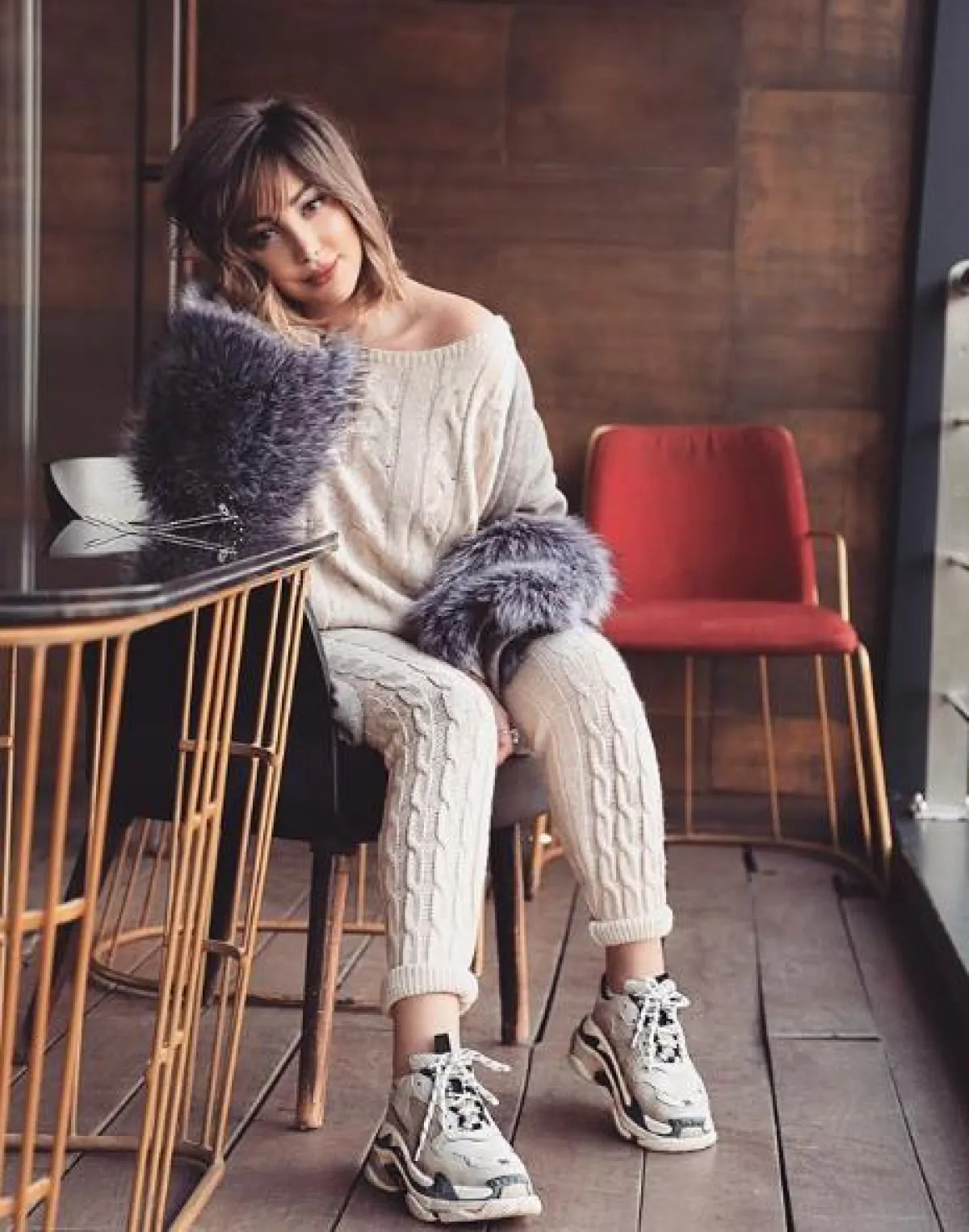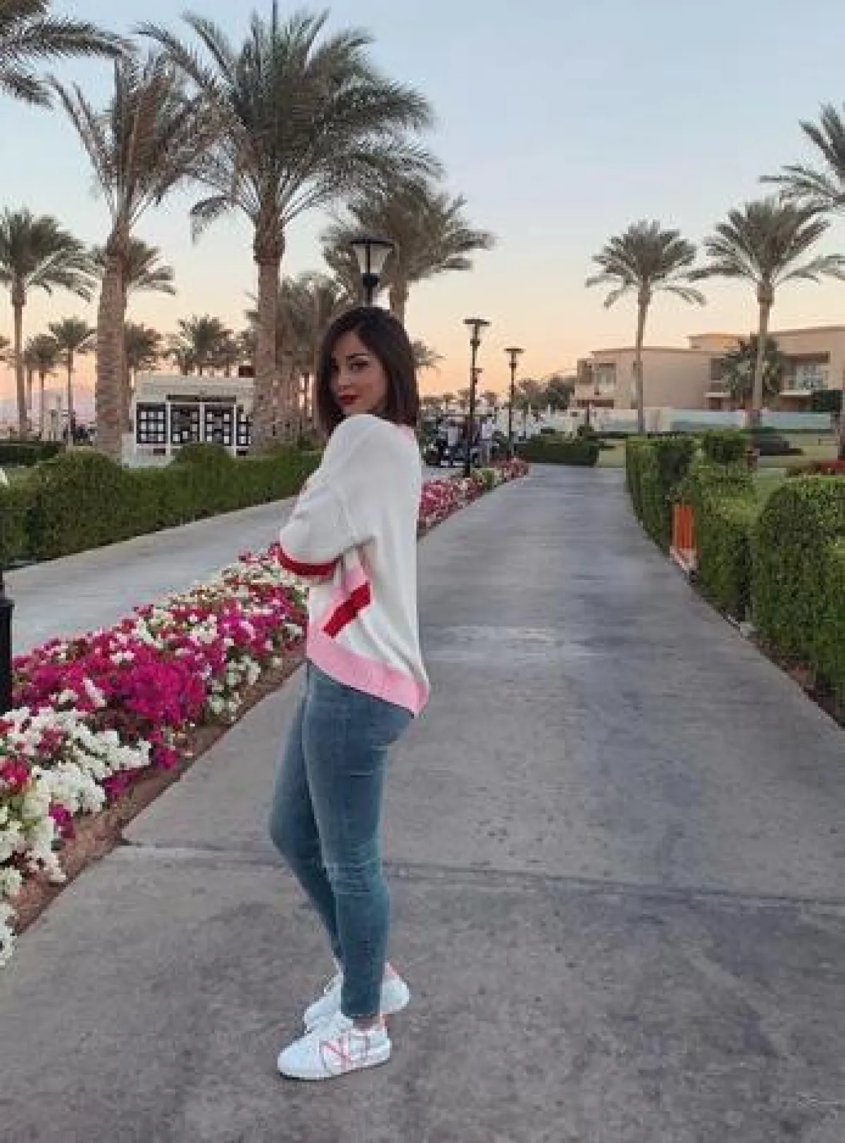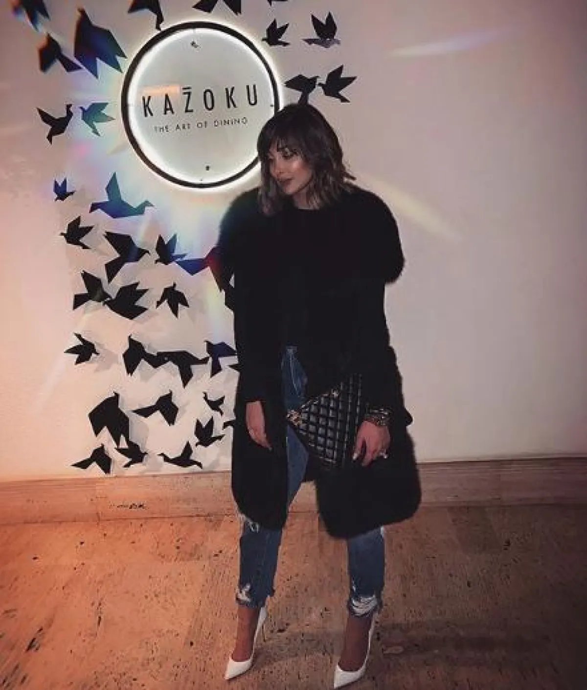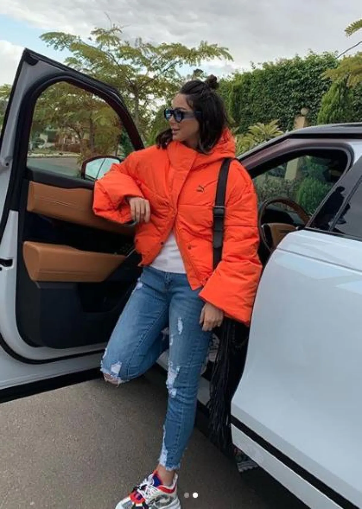 لاطلالة مسائية في إحدى المناسبات، شادهنا بسمة بوسيل وقد نسقت لوك عصريًّا اختارت فيه بنطلون جينز ممزقًا، نسقت معه توب ومعطفًا مزينًا بالفرو باللون الأسود، وشنطة يد كبيرة من الجلد، وأكملت اللوك بحذاء بكعب عالٍ باللون الأبيض.